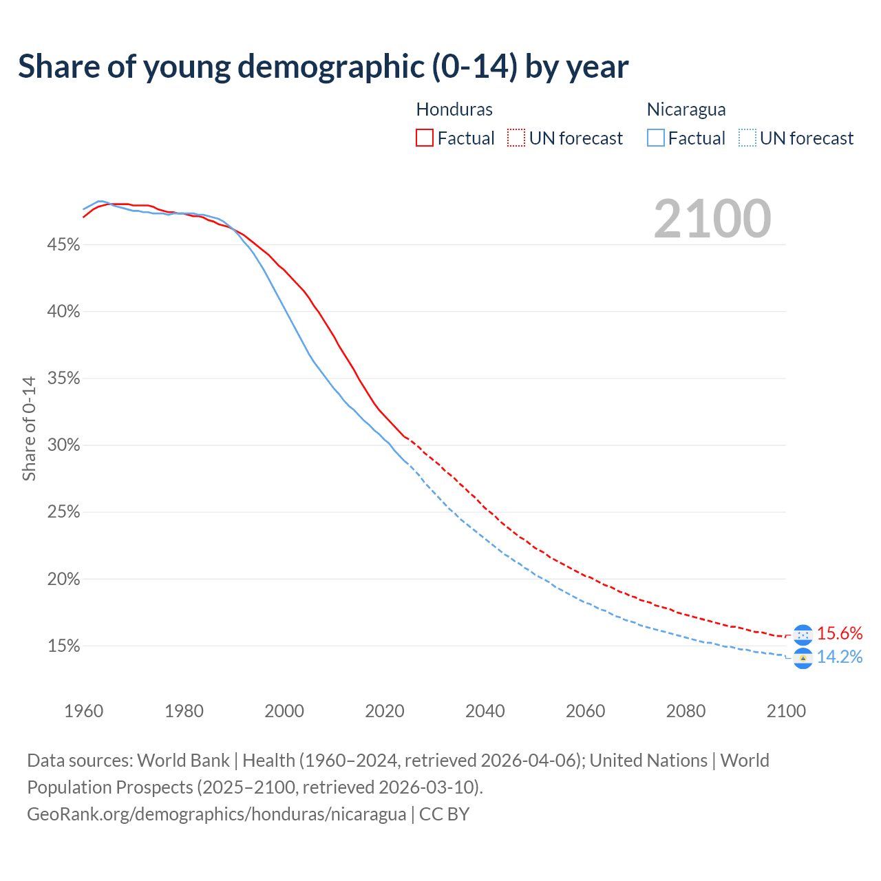 - The share of young demographic (0-15 years old) in Honduras is 30.6% vs 28.8% in Nicaragua.