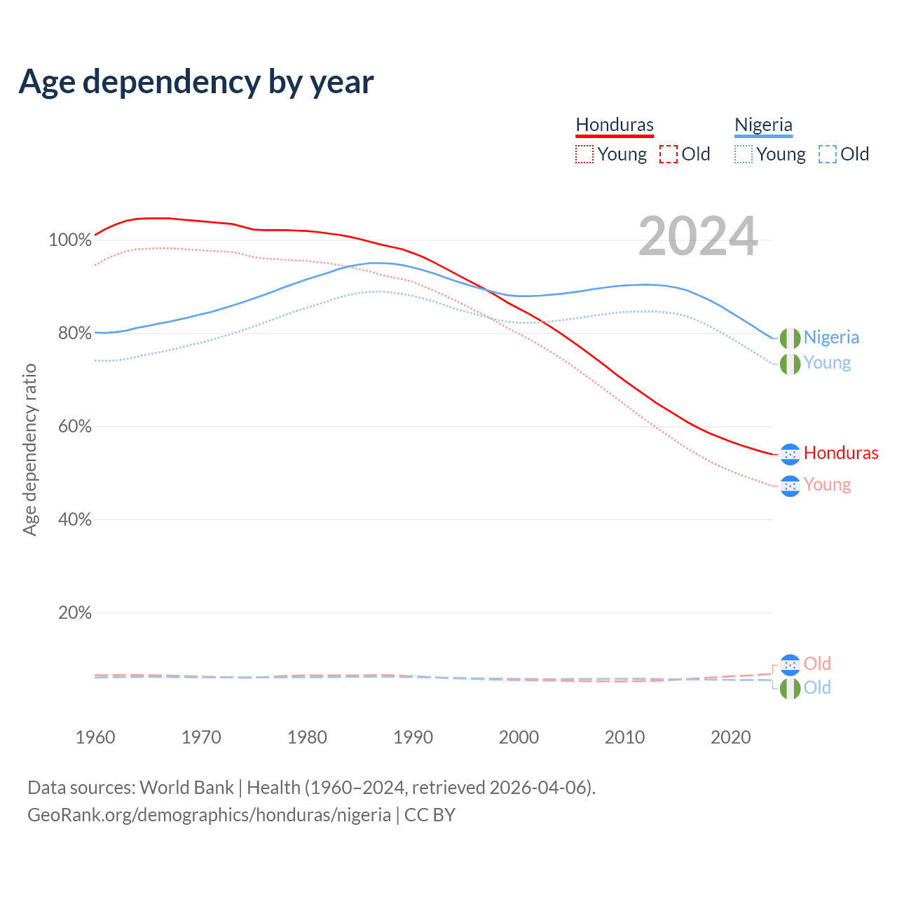 Data sources: World Bank | Health (1960–2024, retrieved 2026-04-06); U.S. Census Bureau (1960–2024, retrieved 2026-02-08).