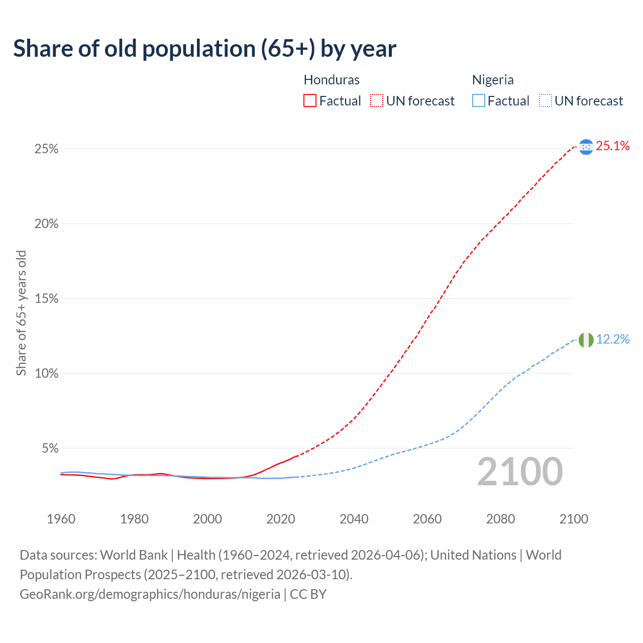 The share of older people aged 65 and over is 4.42% in Honduras and 3.05% in Nigeria. Life expectancy in Honduras compared to Nigeria .