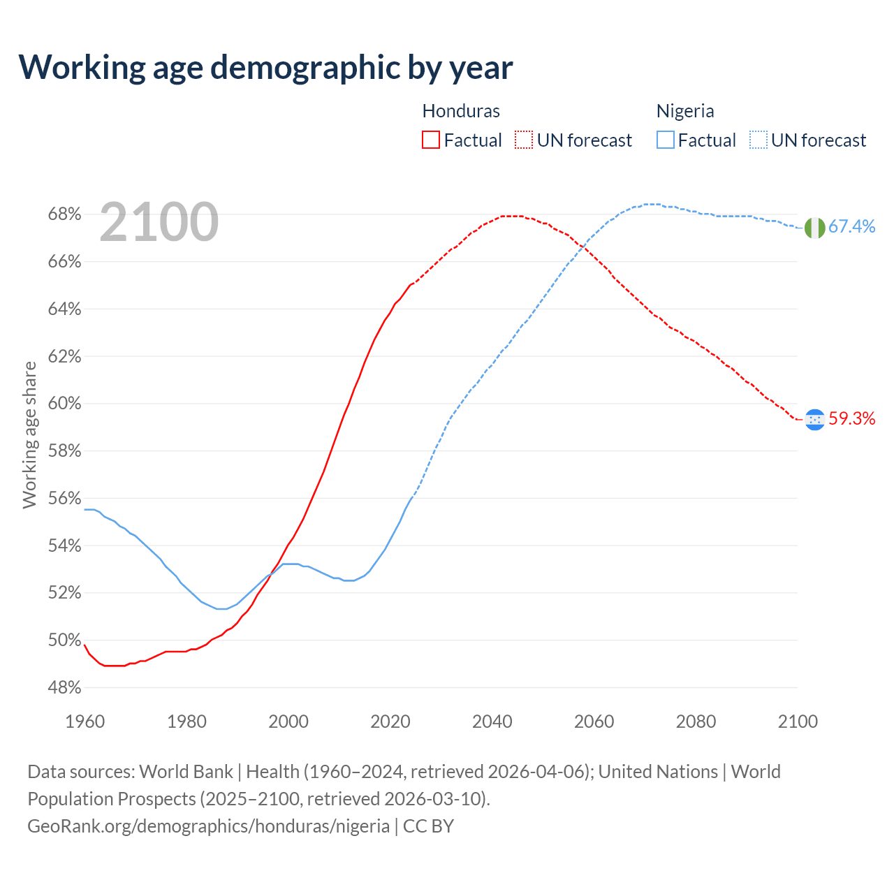 Median age Honduras vs Nigeria, 1960-2100