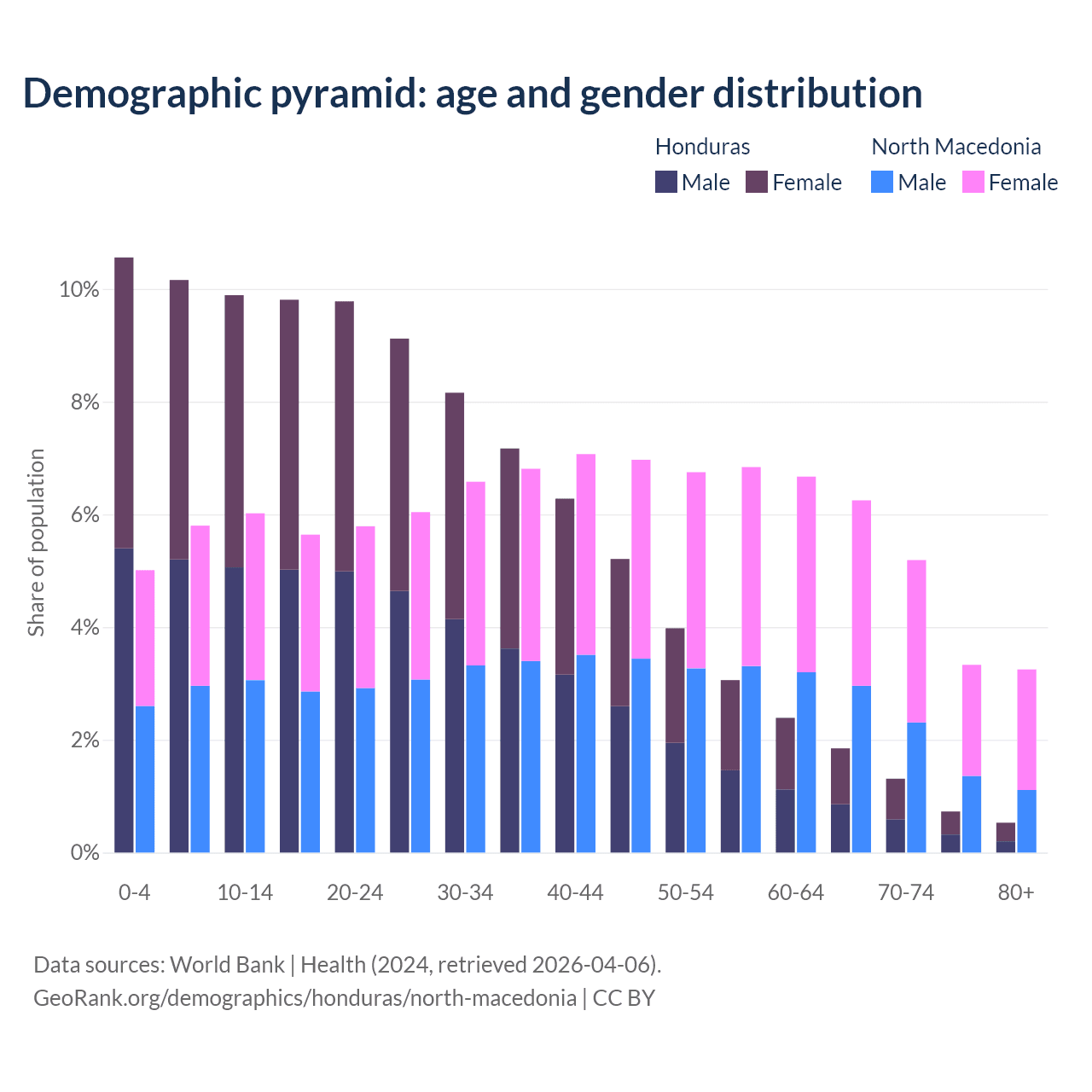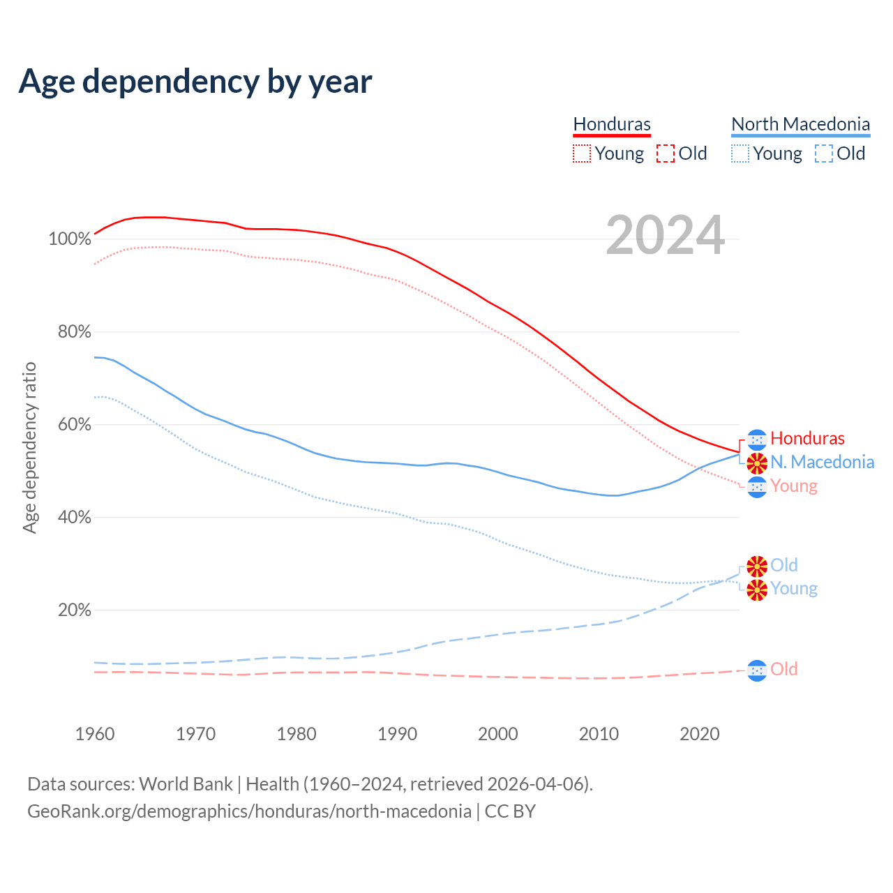 - Honduras is ranked 134/196 by median age (oldest to youngest) vs 37/196 for North Macedonia.