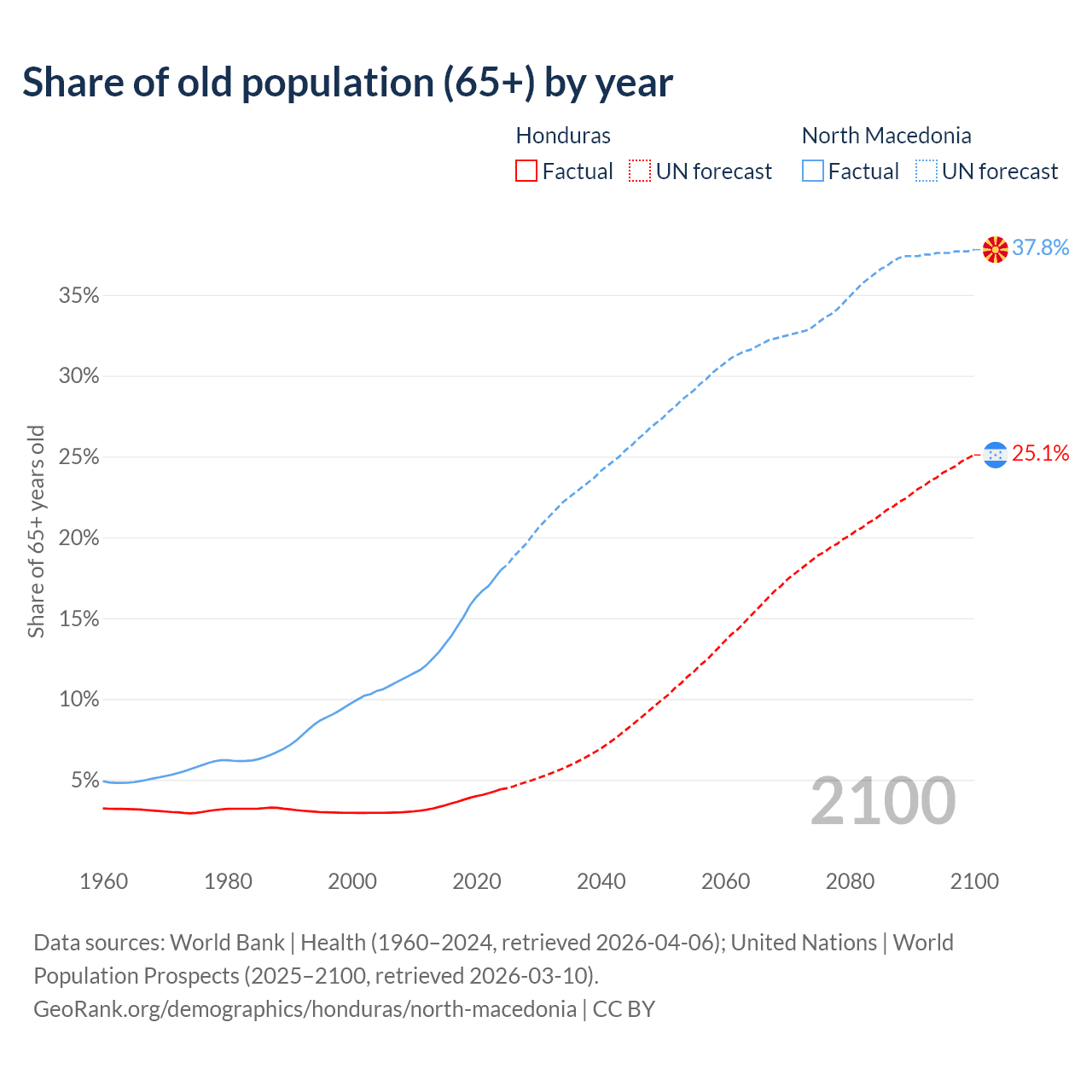 The share of older people aged 65 and over is 4.42% in Honduras and 18% in North Macedonia. Life expectancy in Honduras compared to North Macedonia .