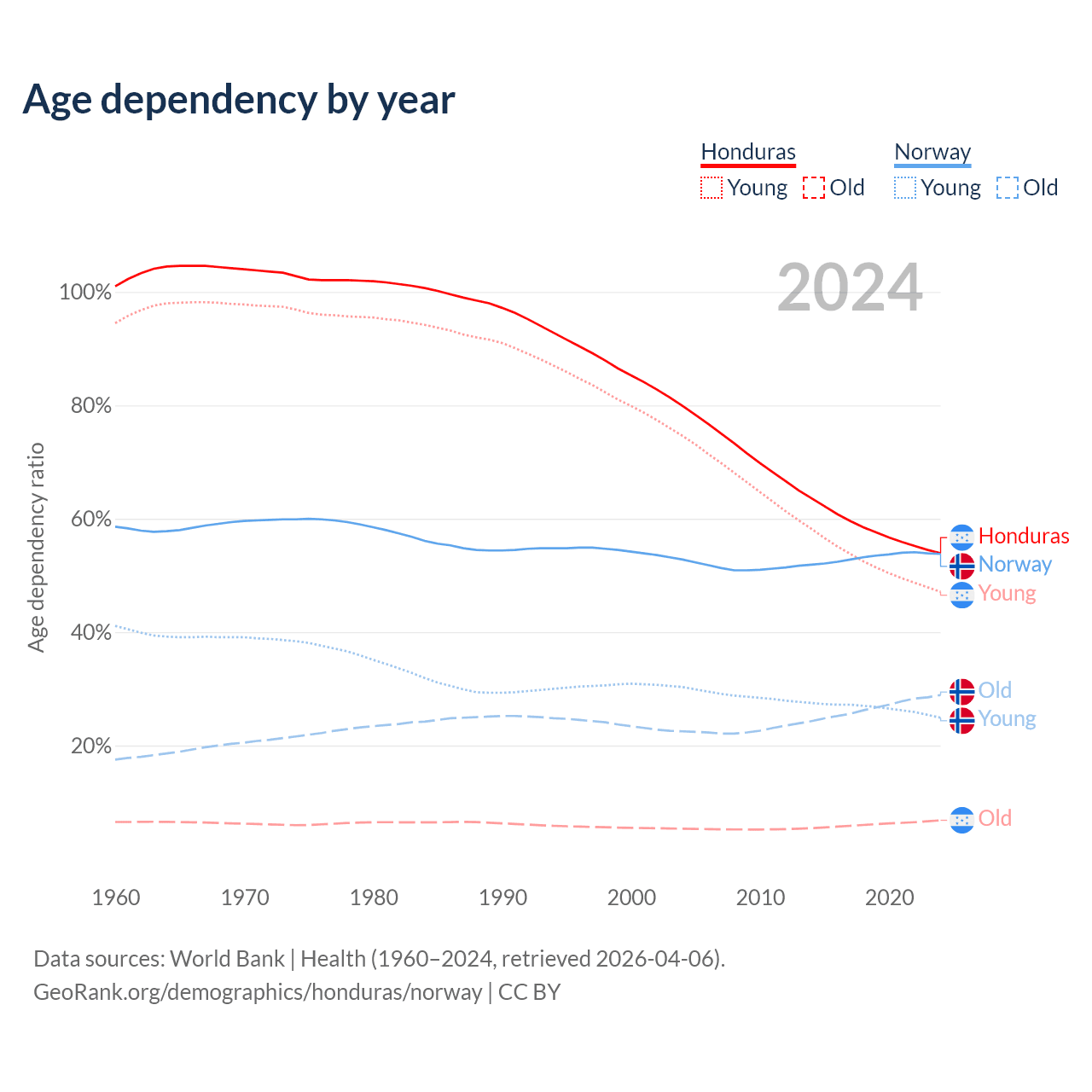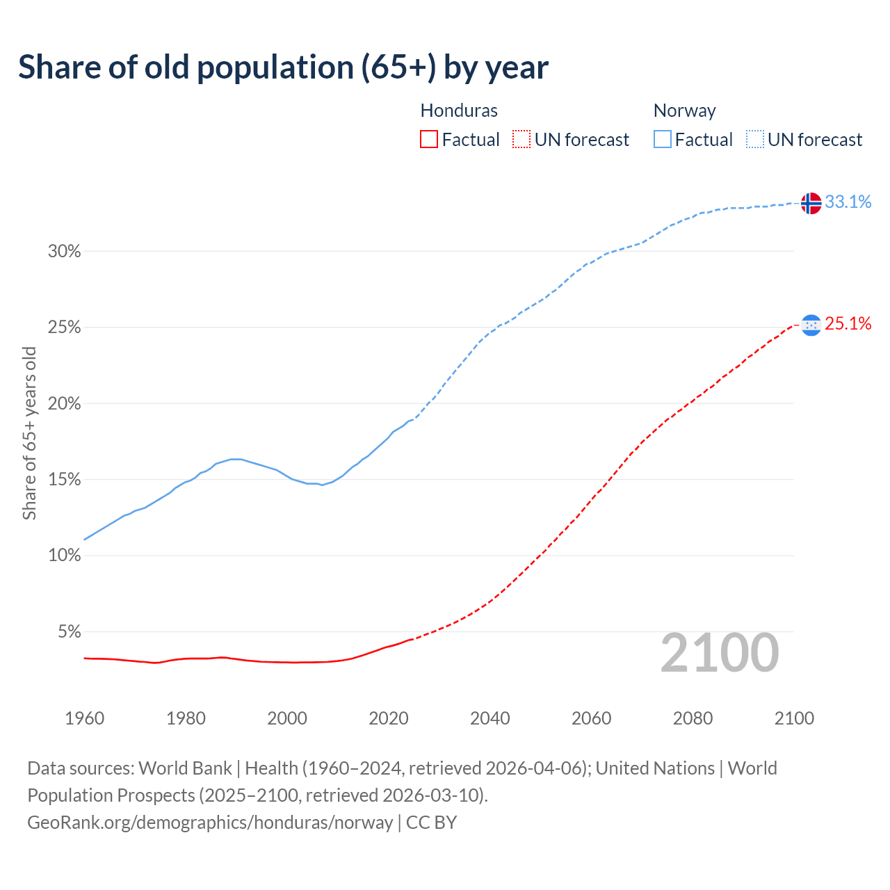 - The share of old-age demographic (65+) in Honduras is 4.42% vs 18.8% in Norway.
