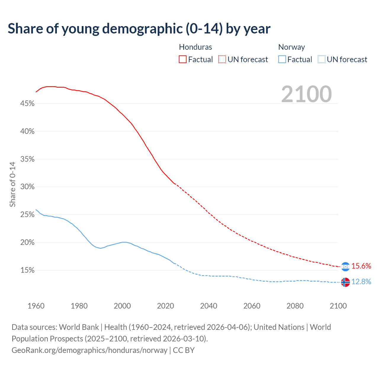 - The share of young demographic (0-15 years old) in Honduras is 30.6% vs 16.2% in Norway.