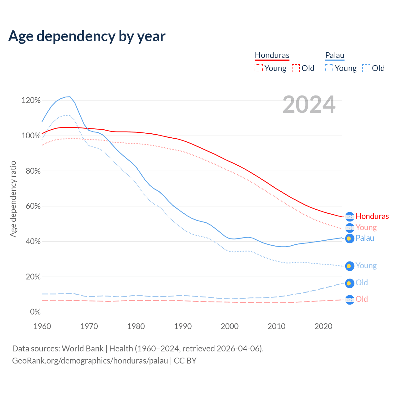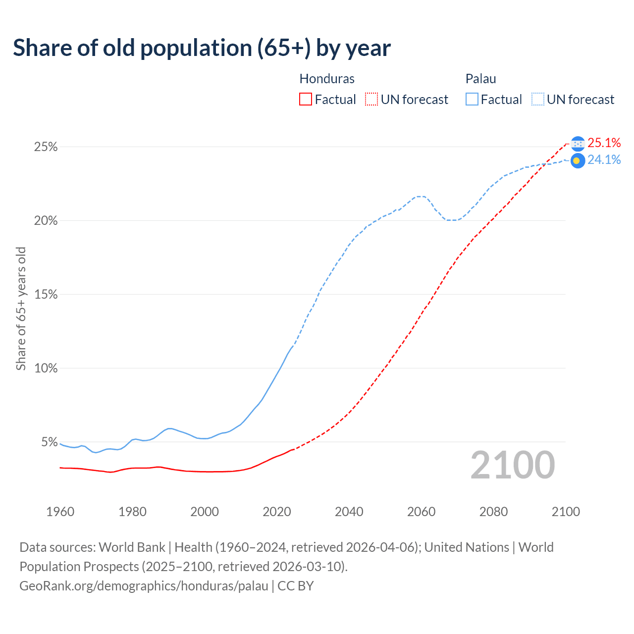 - The share of old-age demographic (65+) in Honduras is 4.42% vs 11.3% in Palau.