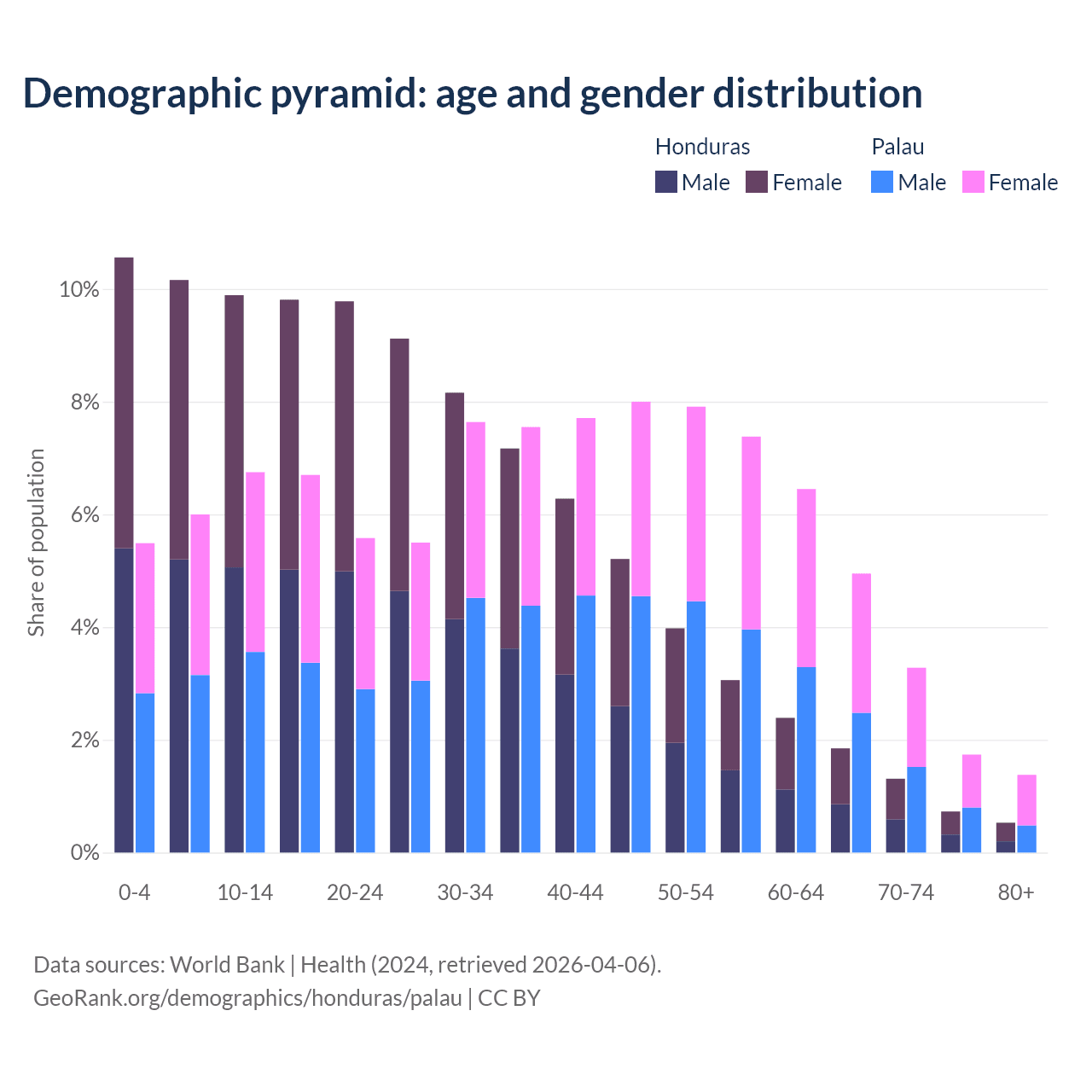 - Honduras is ranked 134/196 by median age (oldest to youngest) vs 53/196 for Palau.