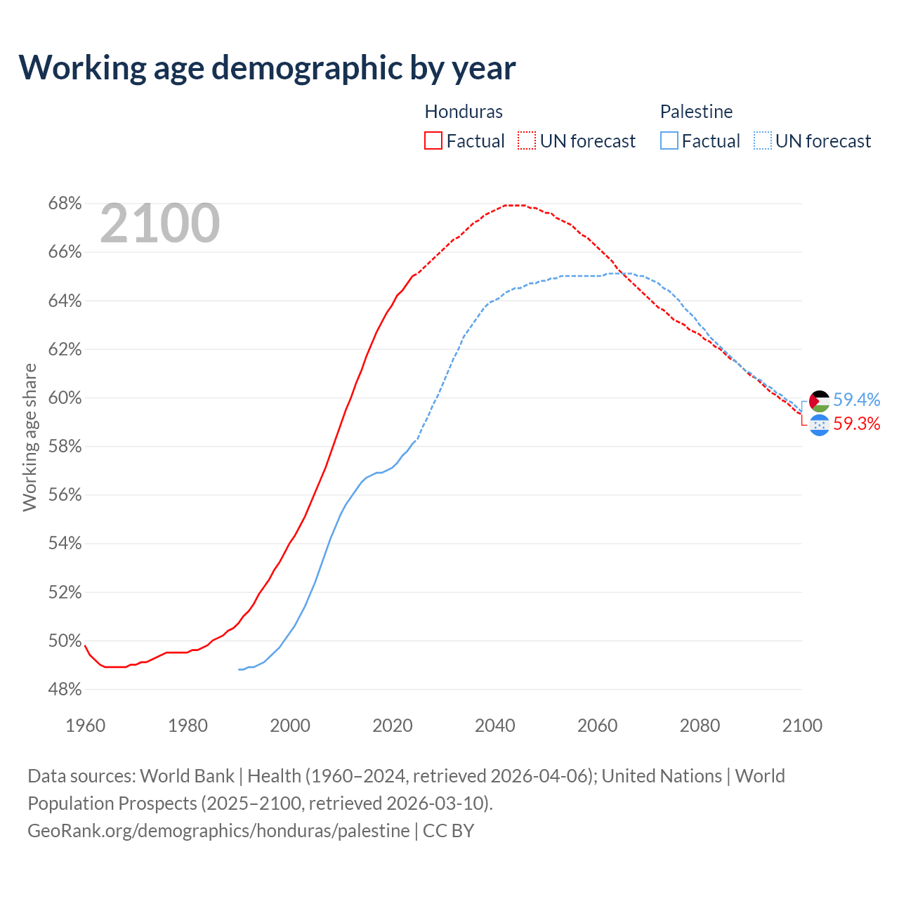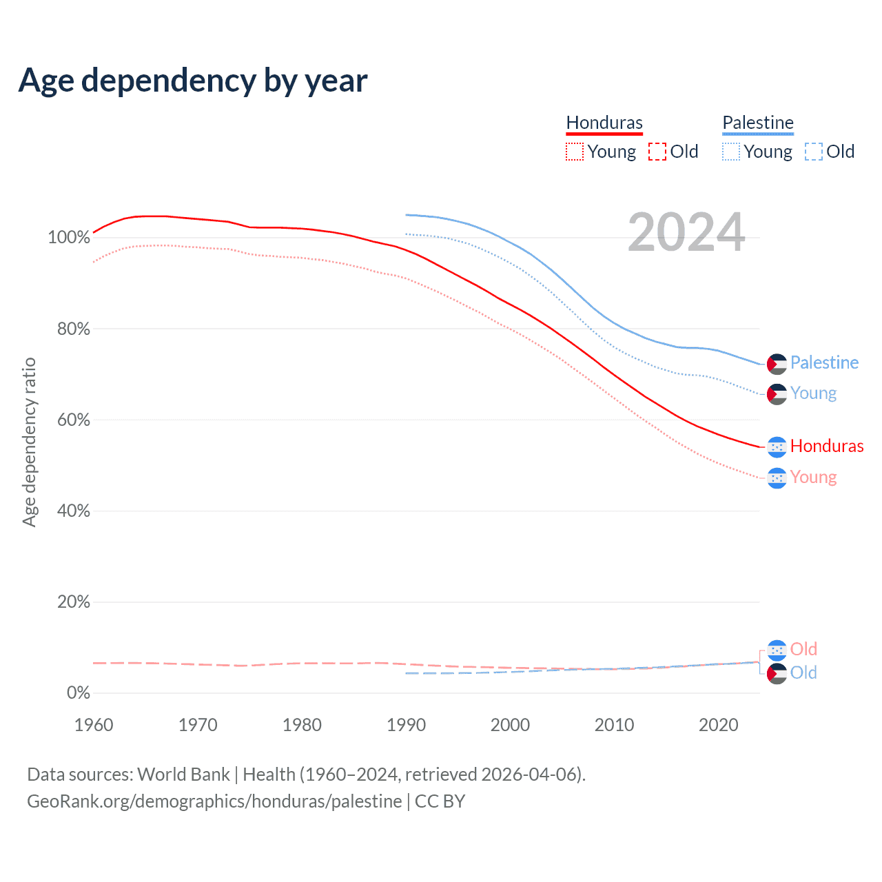 - The share of old-age demographic (65+) in Honduras is 4.42% vs 3.84% in Palestine.