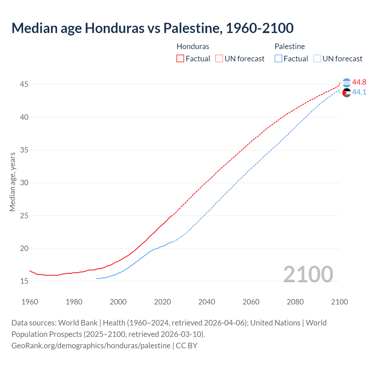 Median age Honduras vs Palestine, 1960-2100