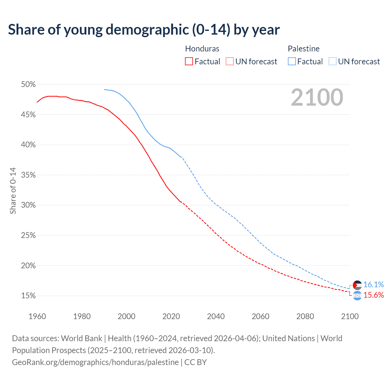 - The share of young demographic (0-15 years old) in Honduras is 30.6% vs 38% in Palestine.