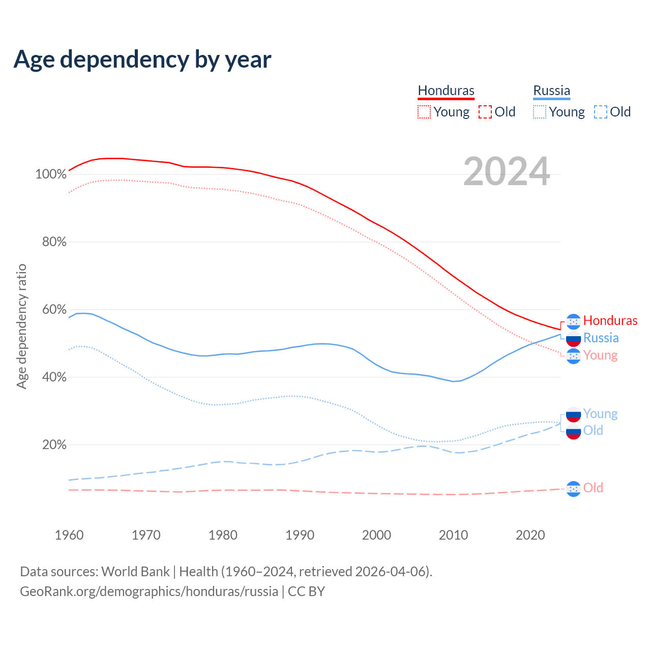 - Honduras is ranked 134/196 by median age (oldest to youngest) vs 42/196 for Russia.