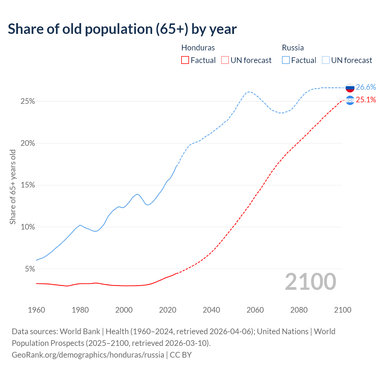 The share of older people aged 65 and over is 4.42% in Honduras and 17.2% in Russia. Life expectancy in Honduras compared to Russia .
