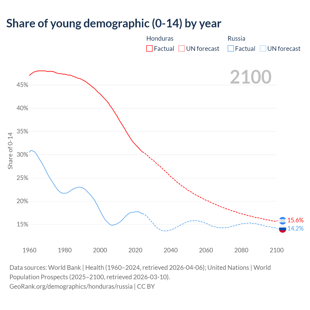 - The share of young demographic (0-15 years old) in Honduras is 30.6% vs 17.3% in Russia.