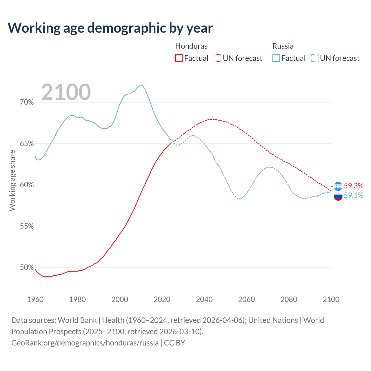 - Honduras has 7.3M working age adults (aged 15-64) vs 93M in Russia.