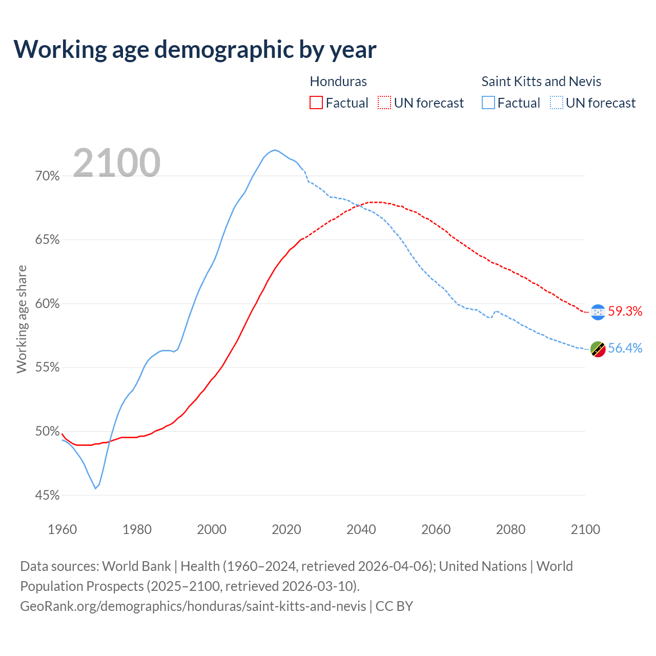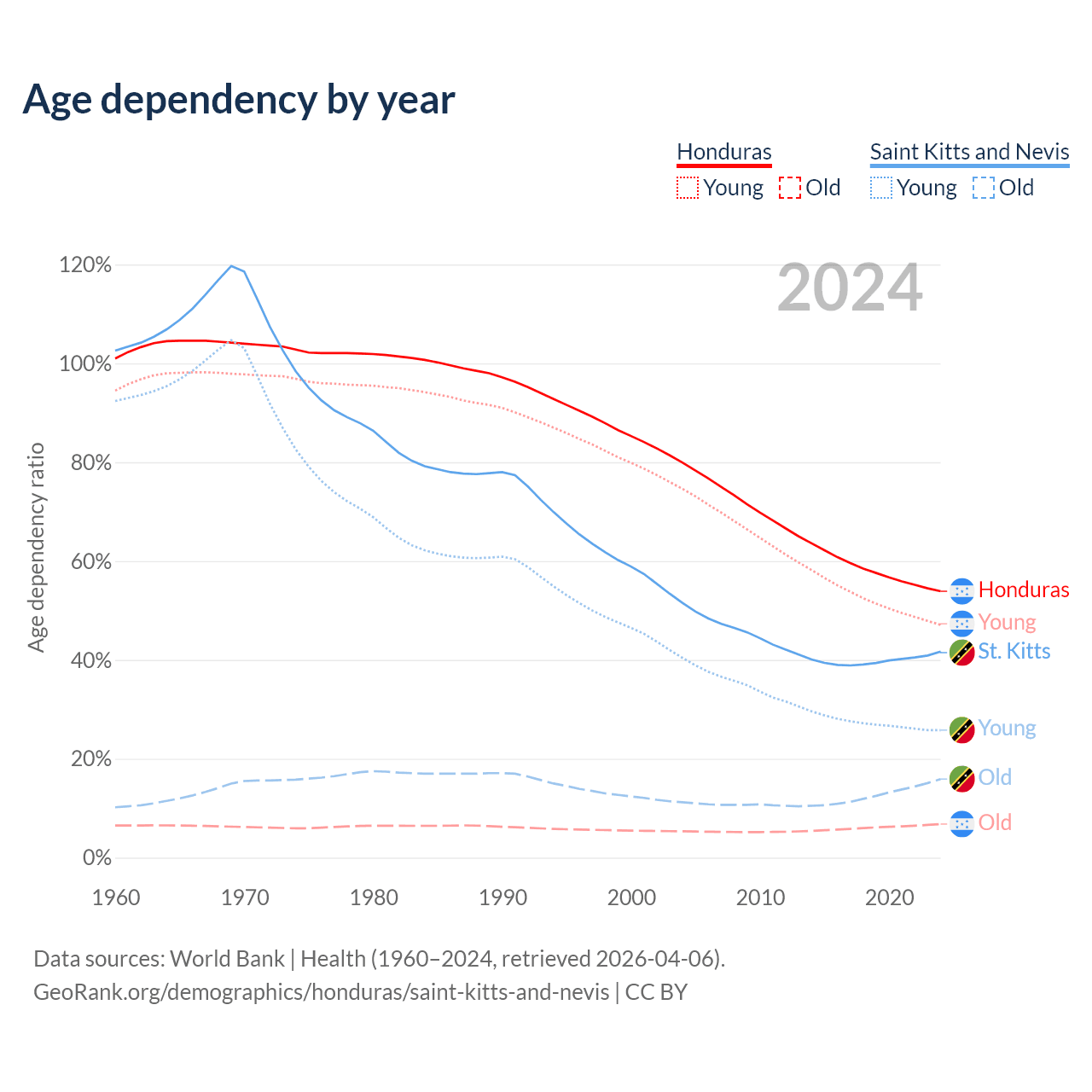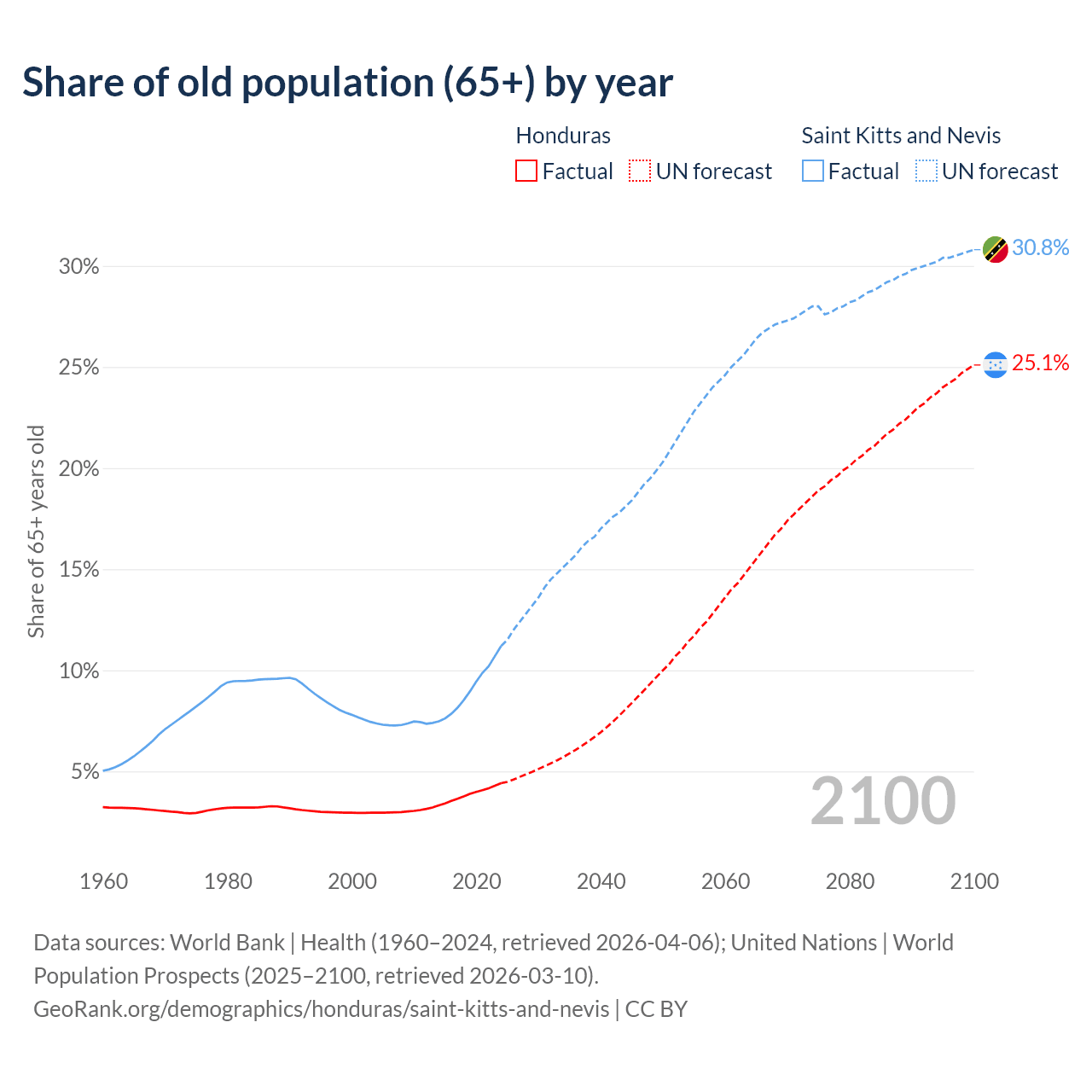 The share of older people aged 65 and over is 4.42% in Honduras and 11.2% in Saint Kitts and Nevis. Life expectancy in Honduras compared to Saint Kitts and Nevis .