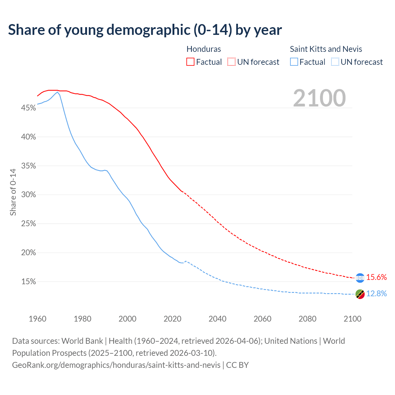 - The share of young demographic (0-15 years old) in Honduras is 30.6% vs 18.2% in Saint Kitts and Nevis.