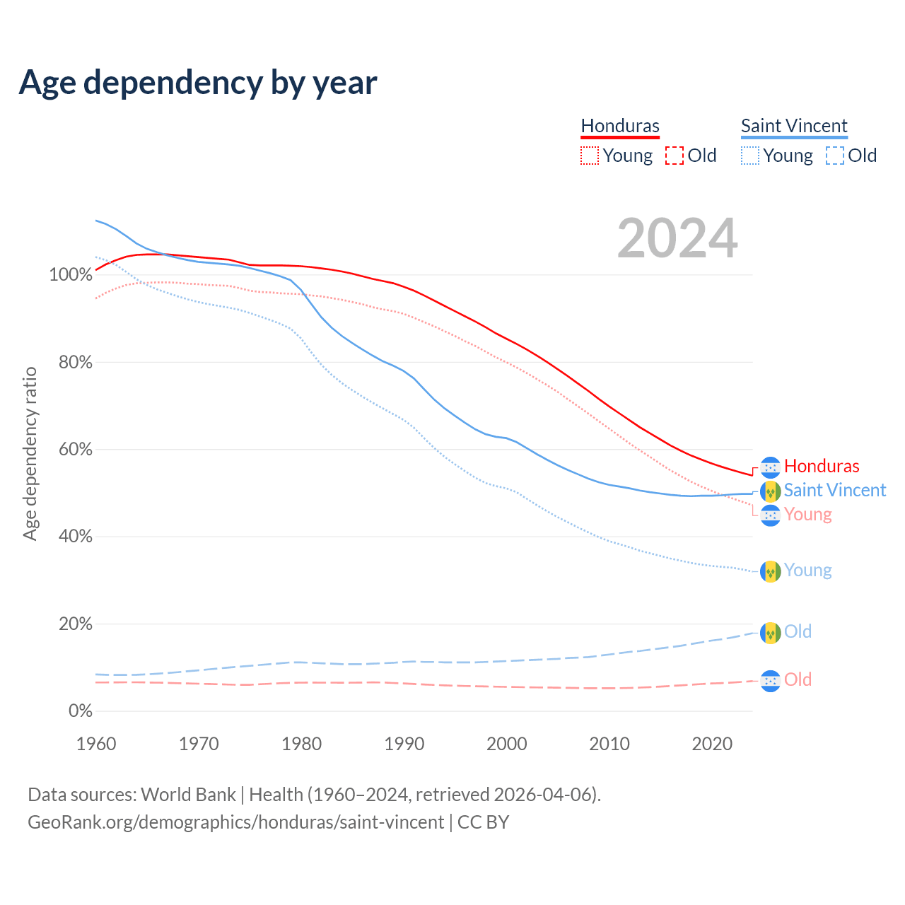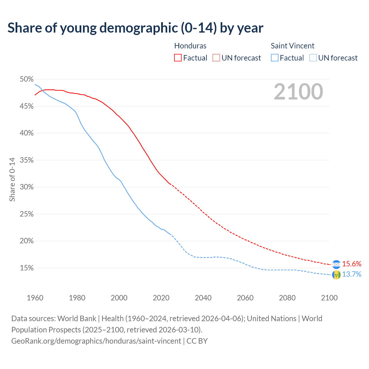 - The share of young demographic (0-15 years old) in Honduras is 30.6% vs 21.3% in Saint Vincent.