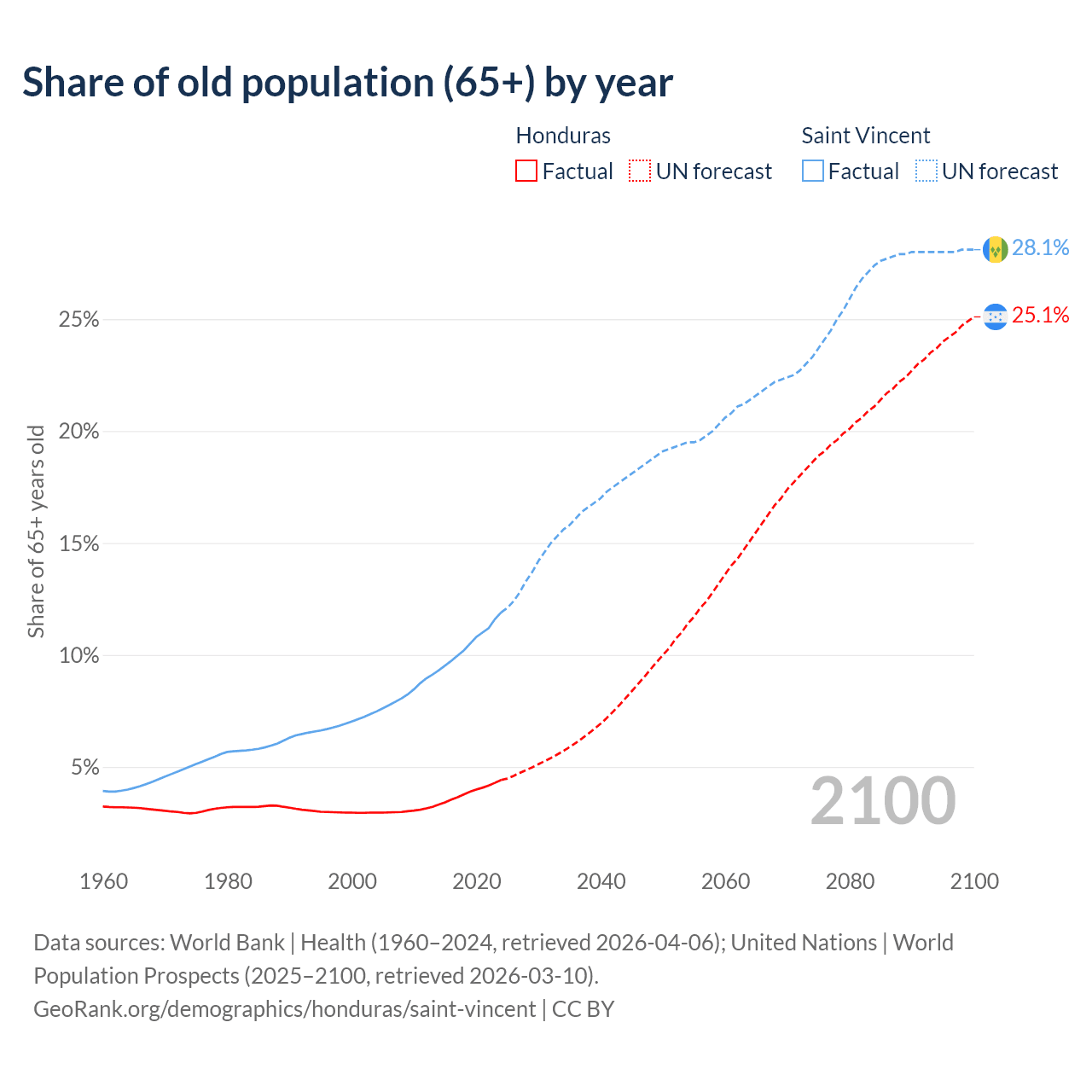 - The share of old-age demographic (65+) in Honduras is 4.42% vs 11.9% in Saint Vincent.