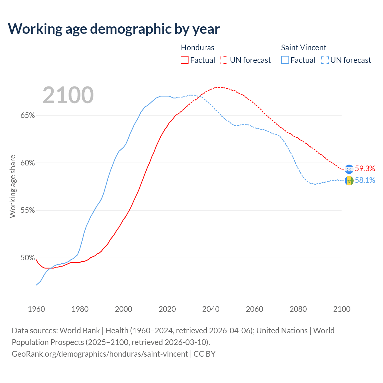- Honduras has 7.3M working age adults (aged 15-64) vs 66.3K in Saint Vincent.