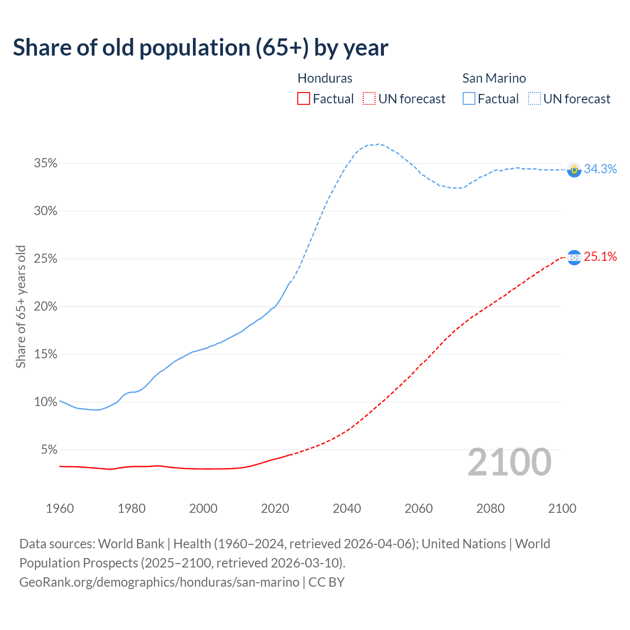 - The share of old-age demographic (65+) in Honduras is 4.42% vs 22.4% in San Marino.