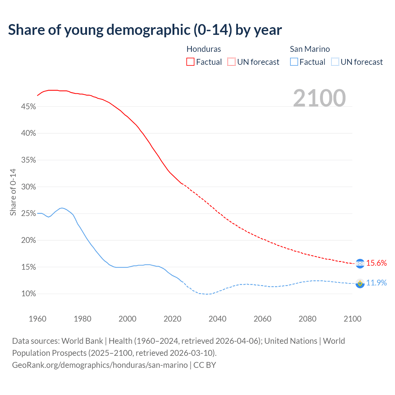 - The share of young demographic (0-15 years old) in Honduras is 30.6% vs 12.3% in San Marino.