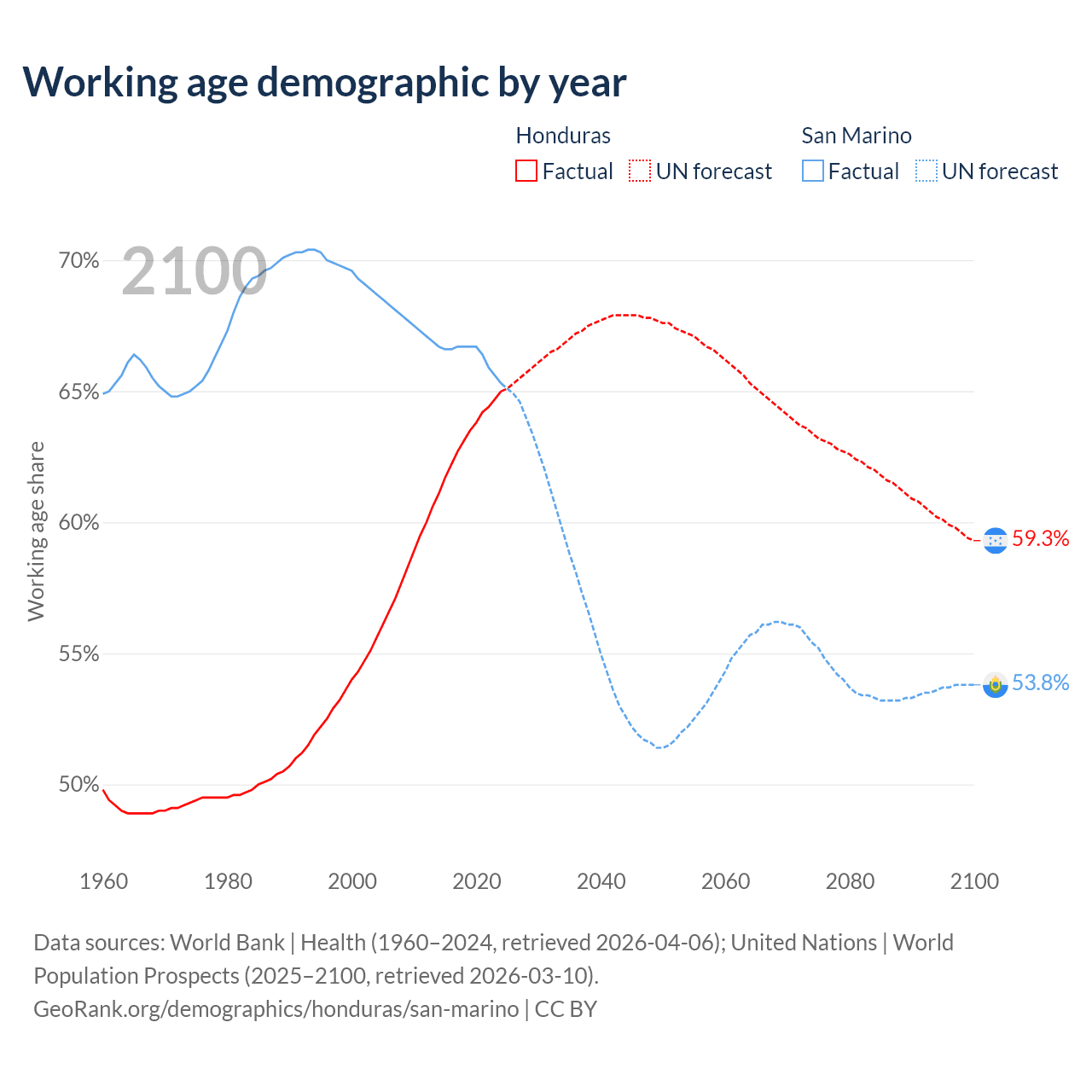 - Honduras has 7.3M working age adults (aged 15-64) vs 22.2K in San Marino.