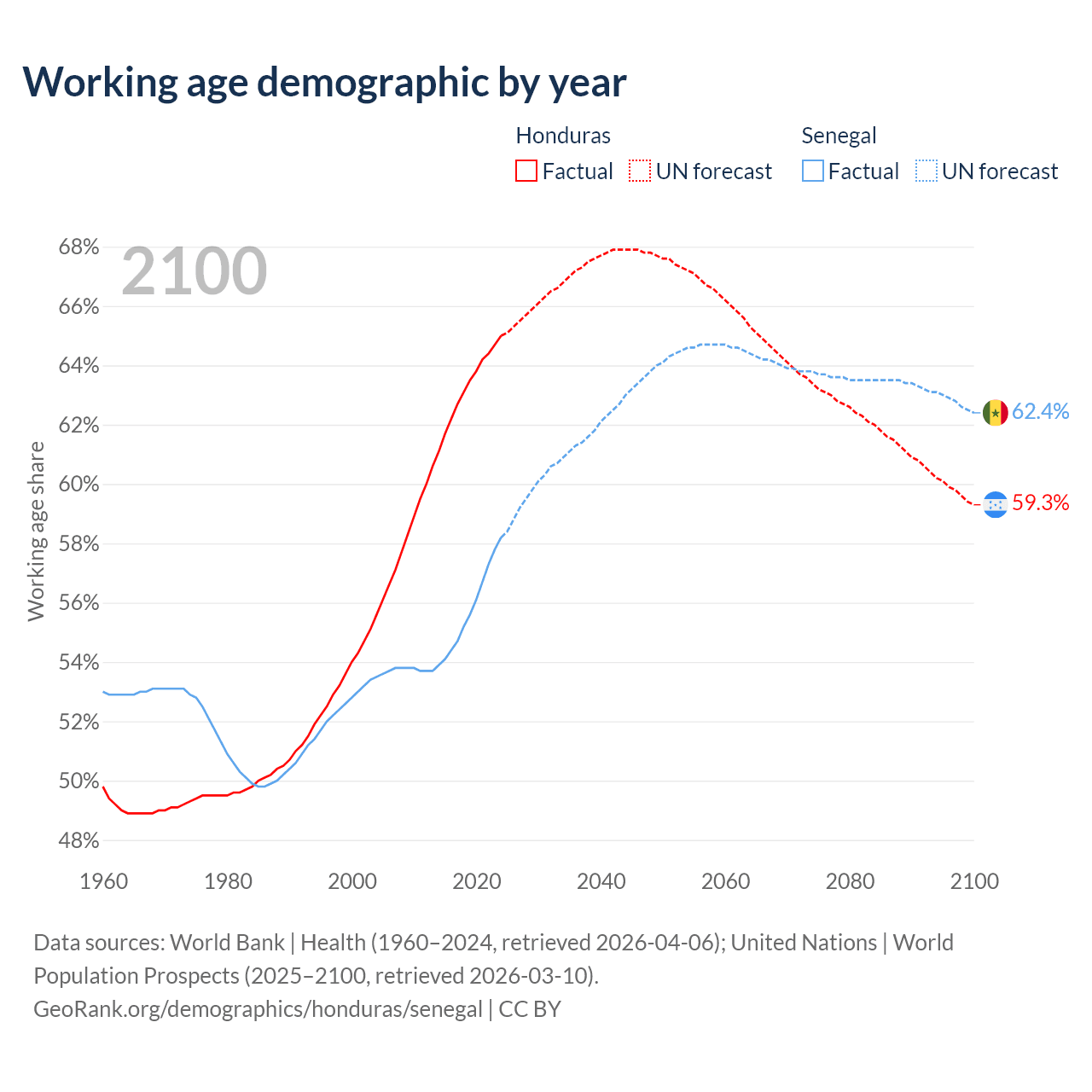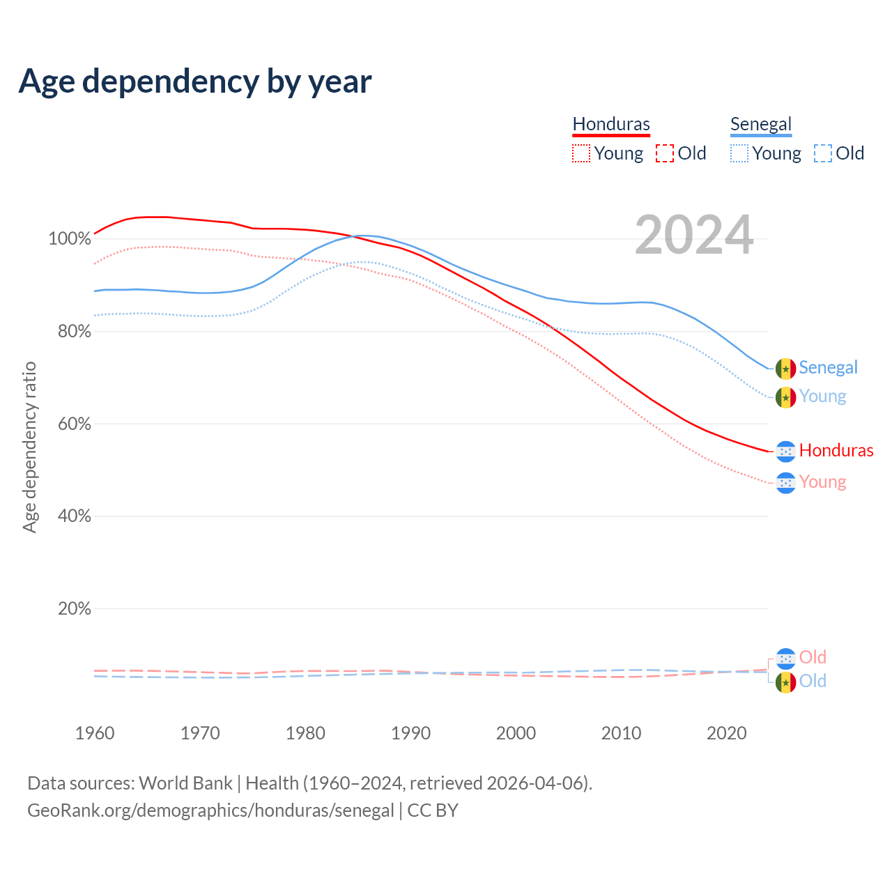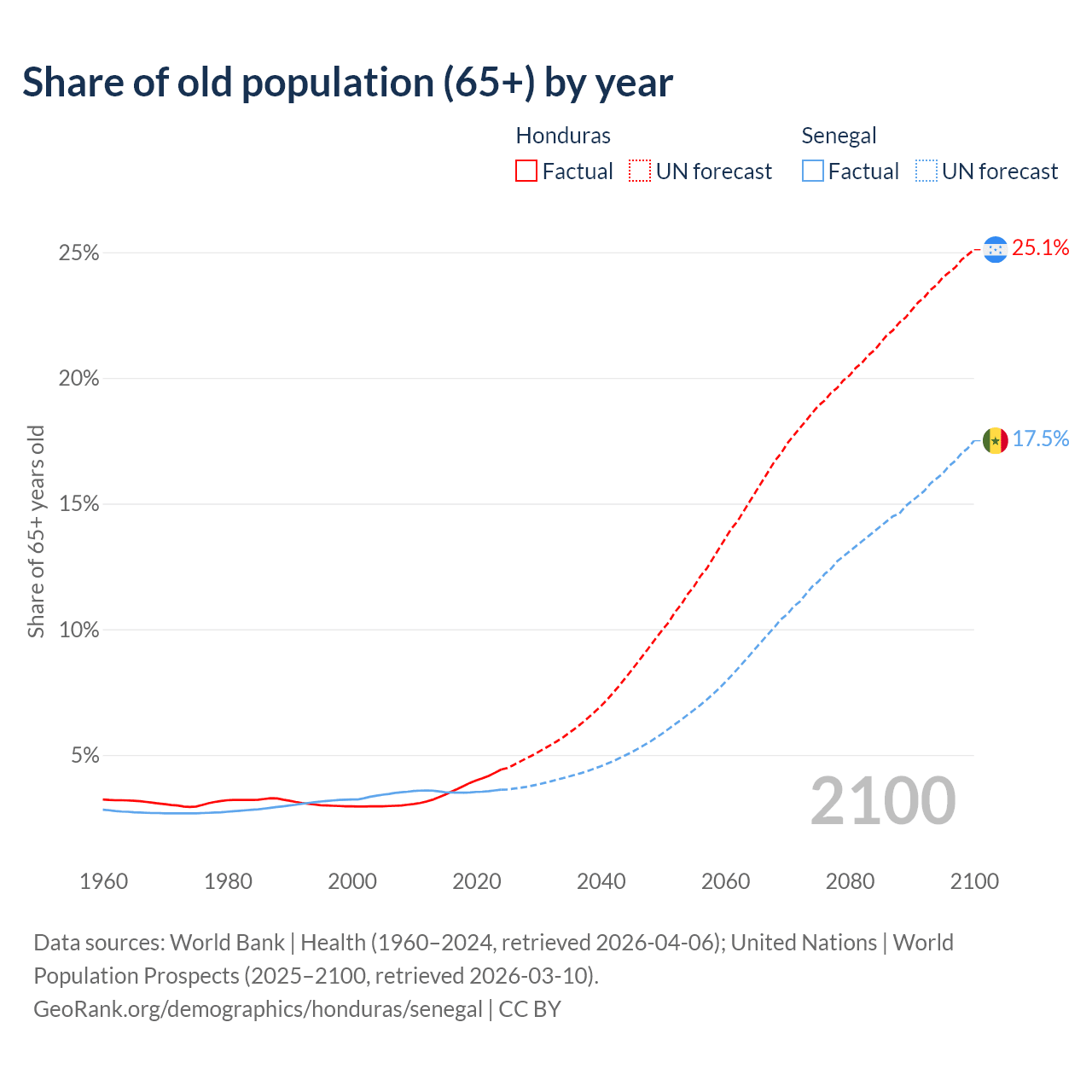 - The share of old-age demographic (65+) in Honduras is 4.42% vs 3.62% in Senegal.