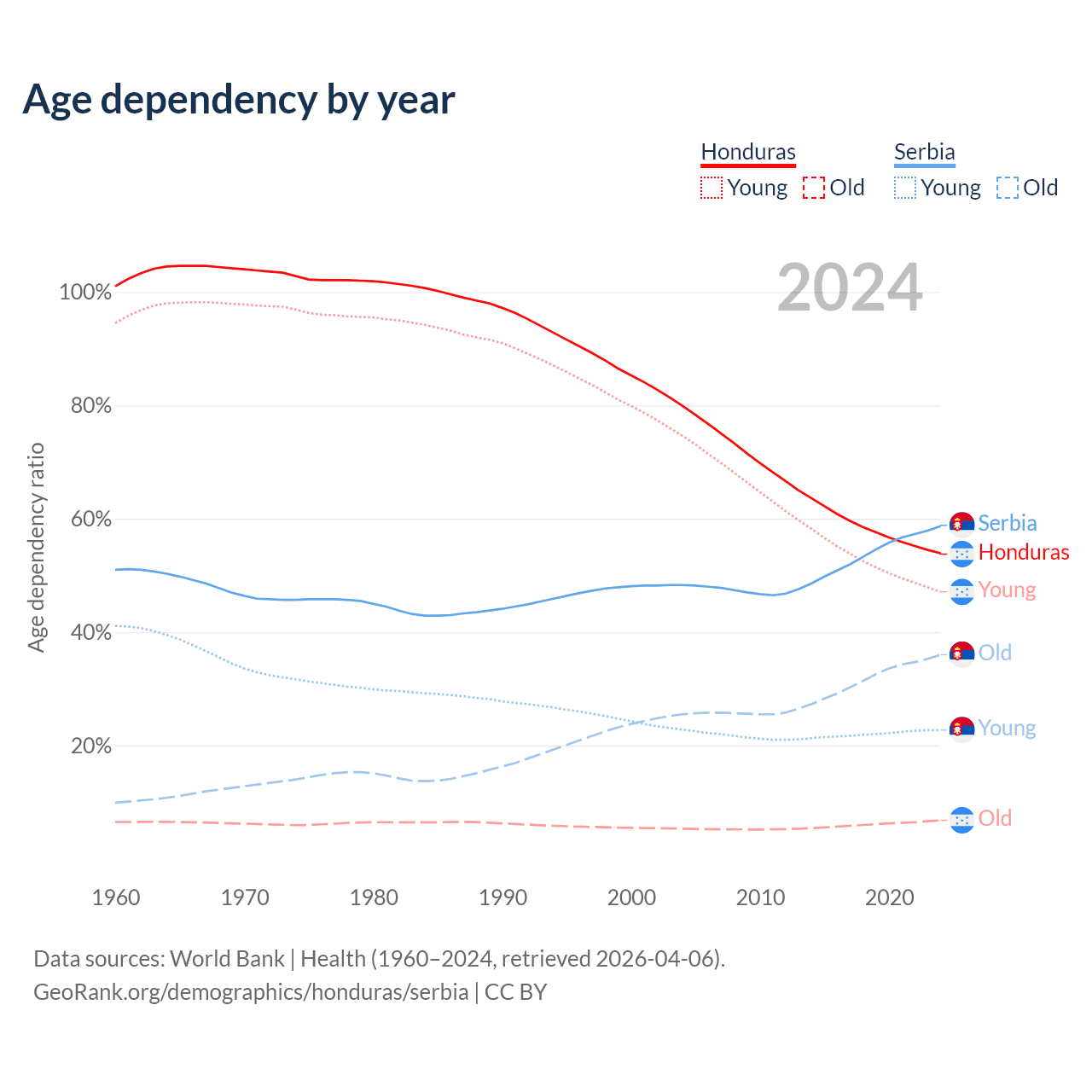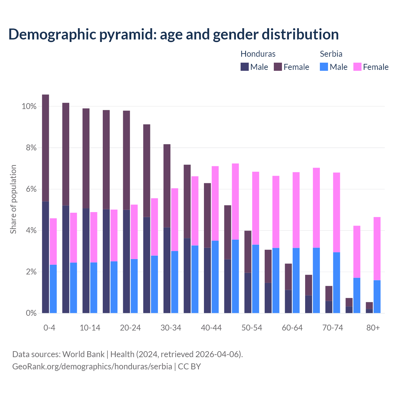 - Honduras is ranked 134/196 by median age (oldest to youngest) vs 15/196 for Serbia.