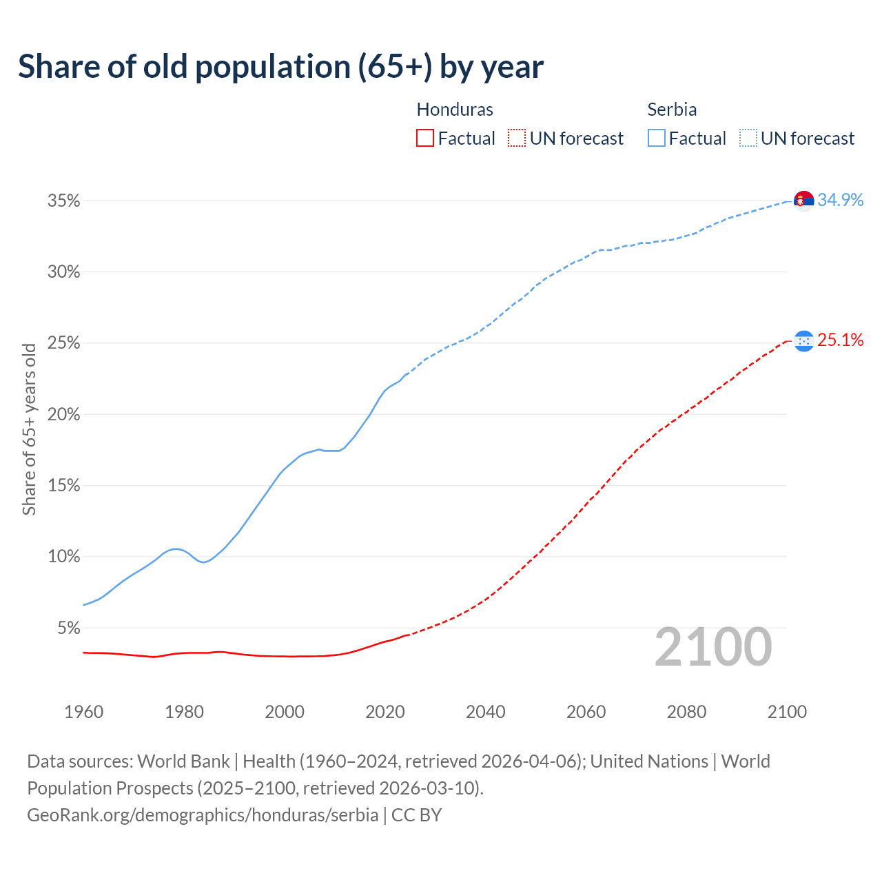 - The share of old-age demographic (65+) in Honduras is 4.42% vs 22.7% in Serbia.