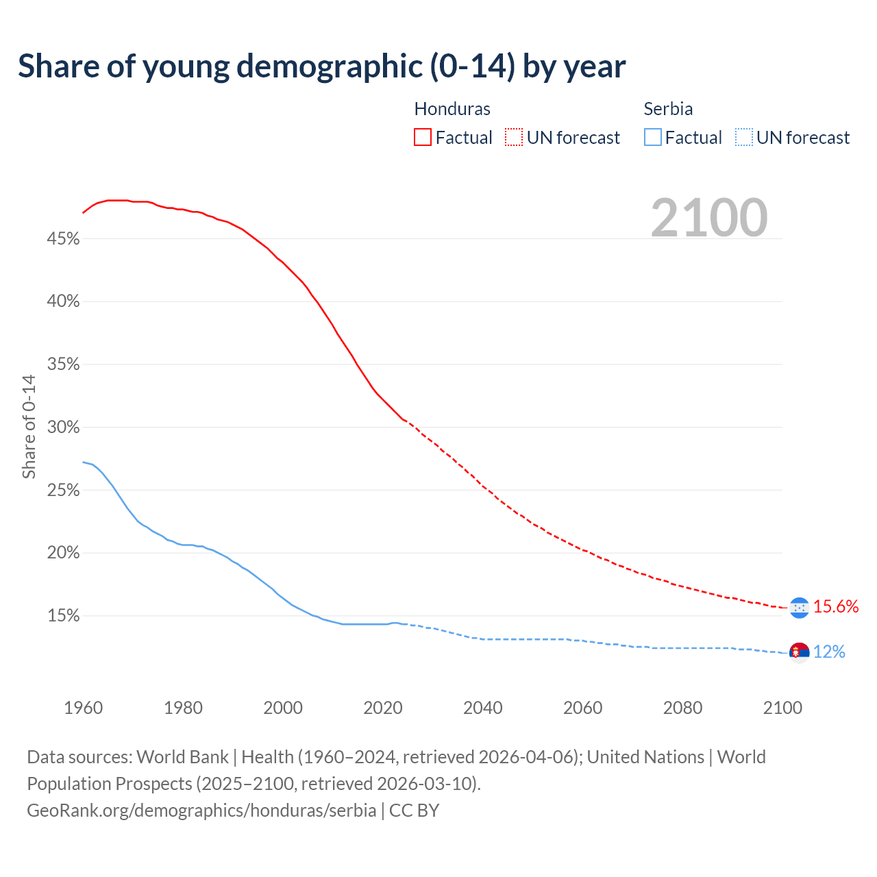 - The share of young demographic (0-15 years old) in Honduras is 30.6% vs 14.3% in Serbia.