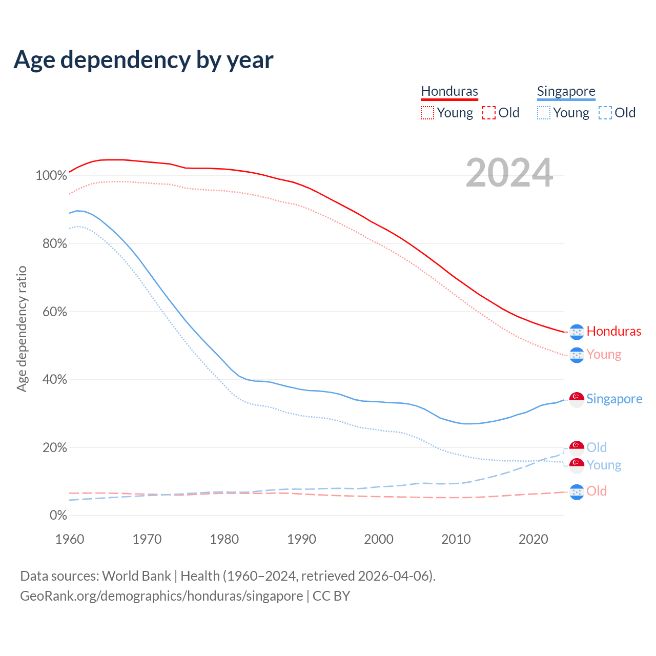 Data sources: World Bank | Health (1960–2024, retrieved 2026-04-06); U.S. Census Bureau (1960–2024, retrieved 2026-02-08).