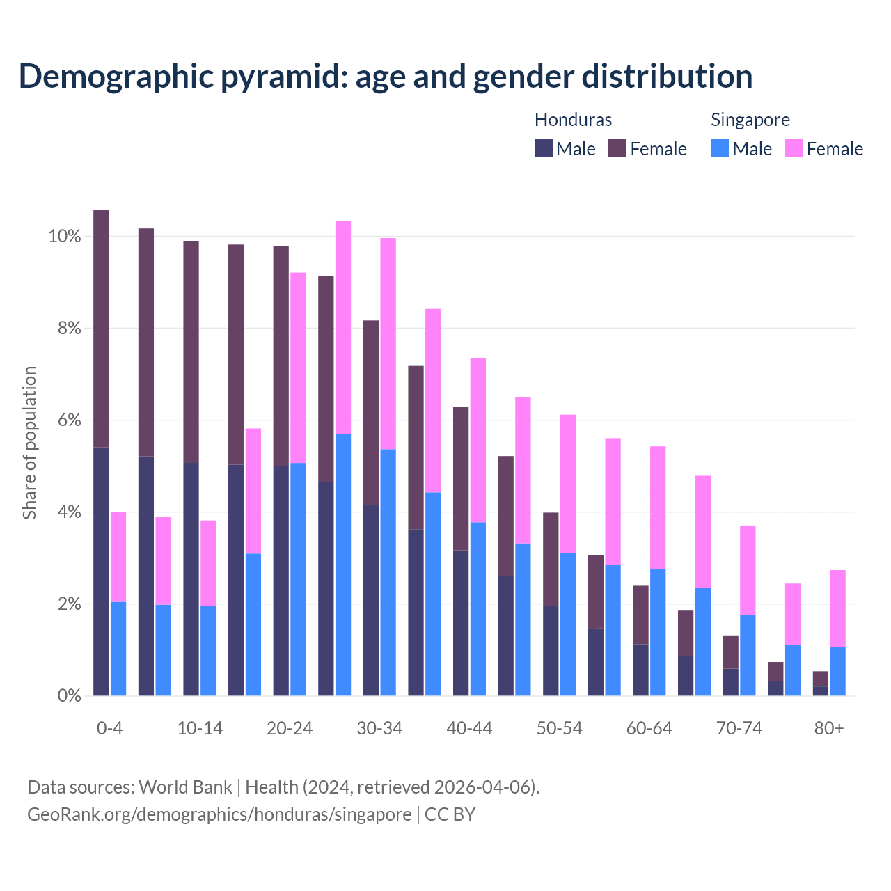 The share of older people aged 65 and over is 4.42% in Honduras and 13.7% in Singapore. Life expectancy in Honduras compared to Singapore .