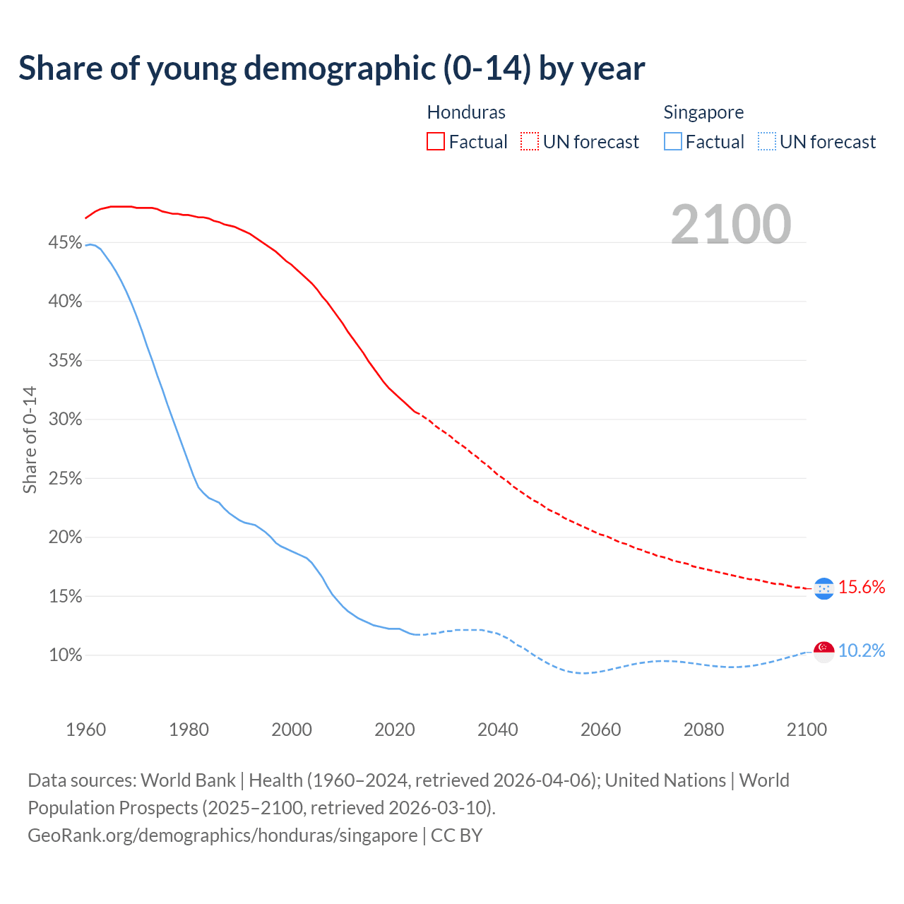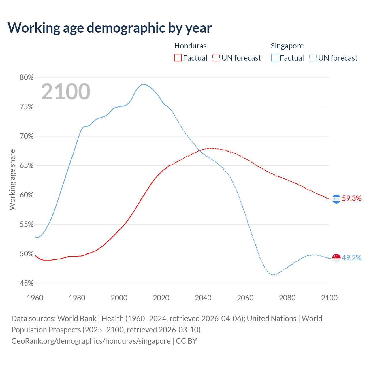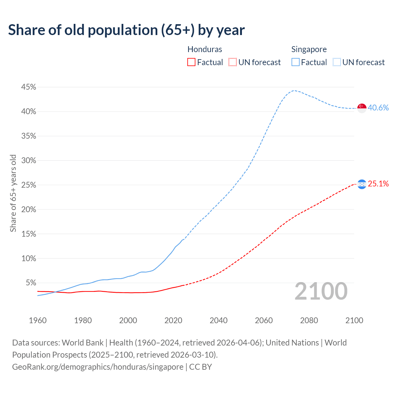 Median age Honduras vs Singapore, 1960-2100