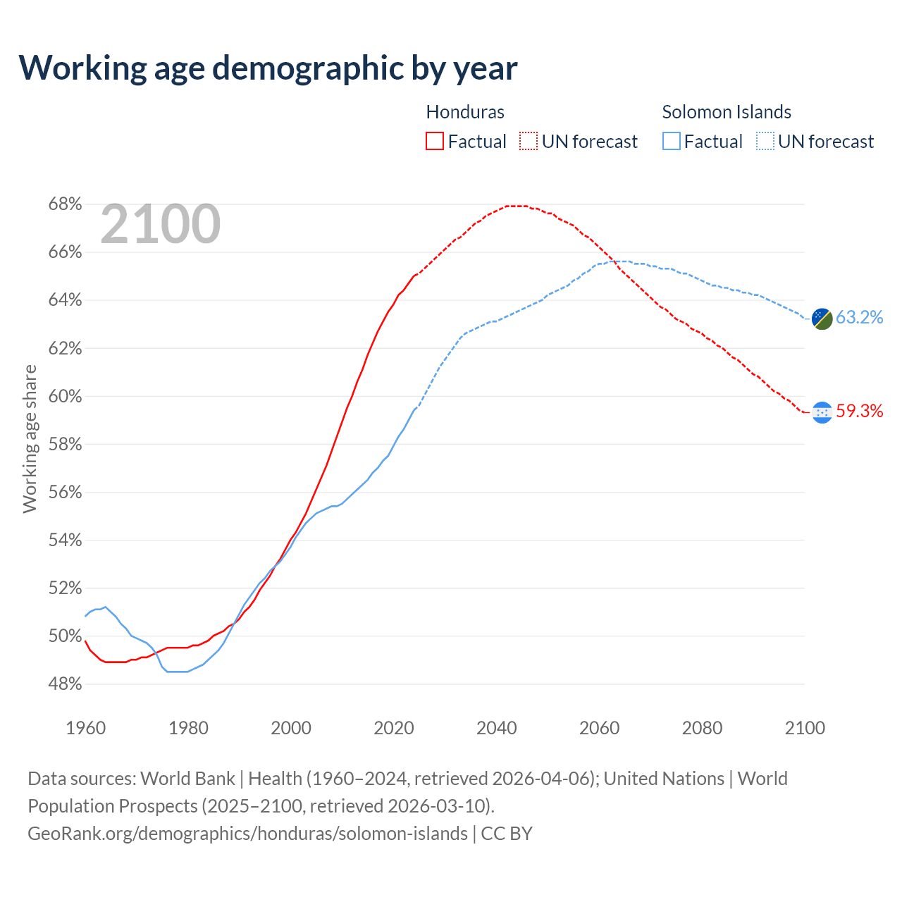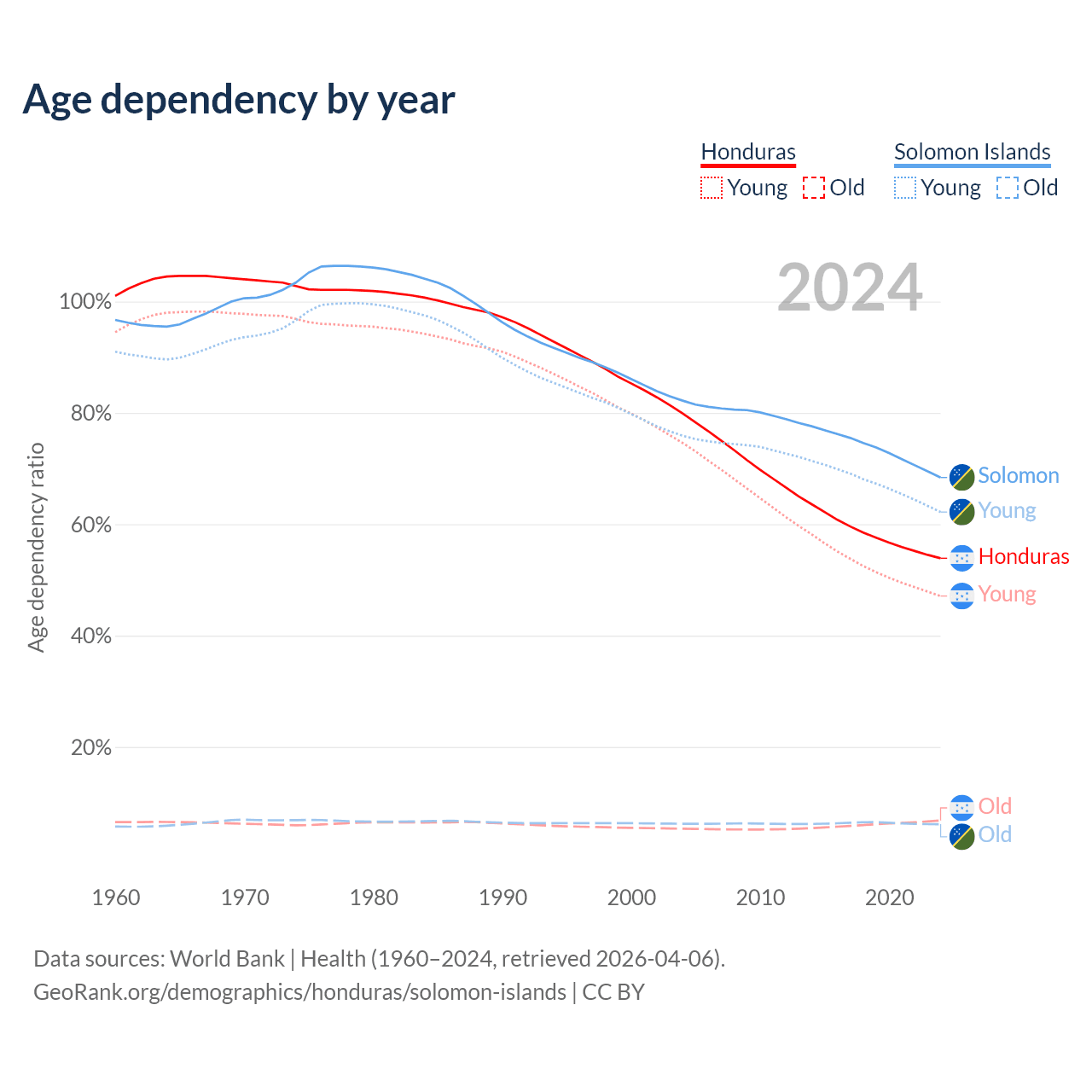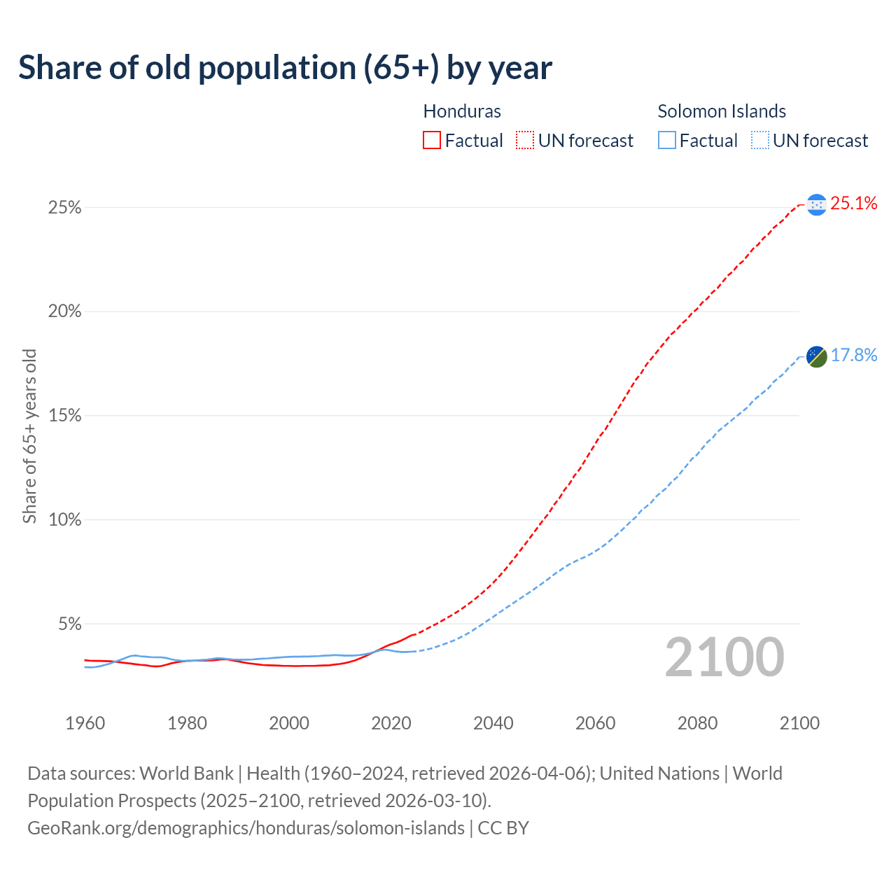 - The share of old-age demographic (65+) in Honduras is 4.42% vs 3.64% in the Solomon Islands.