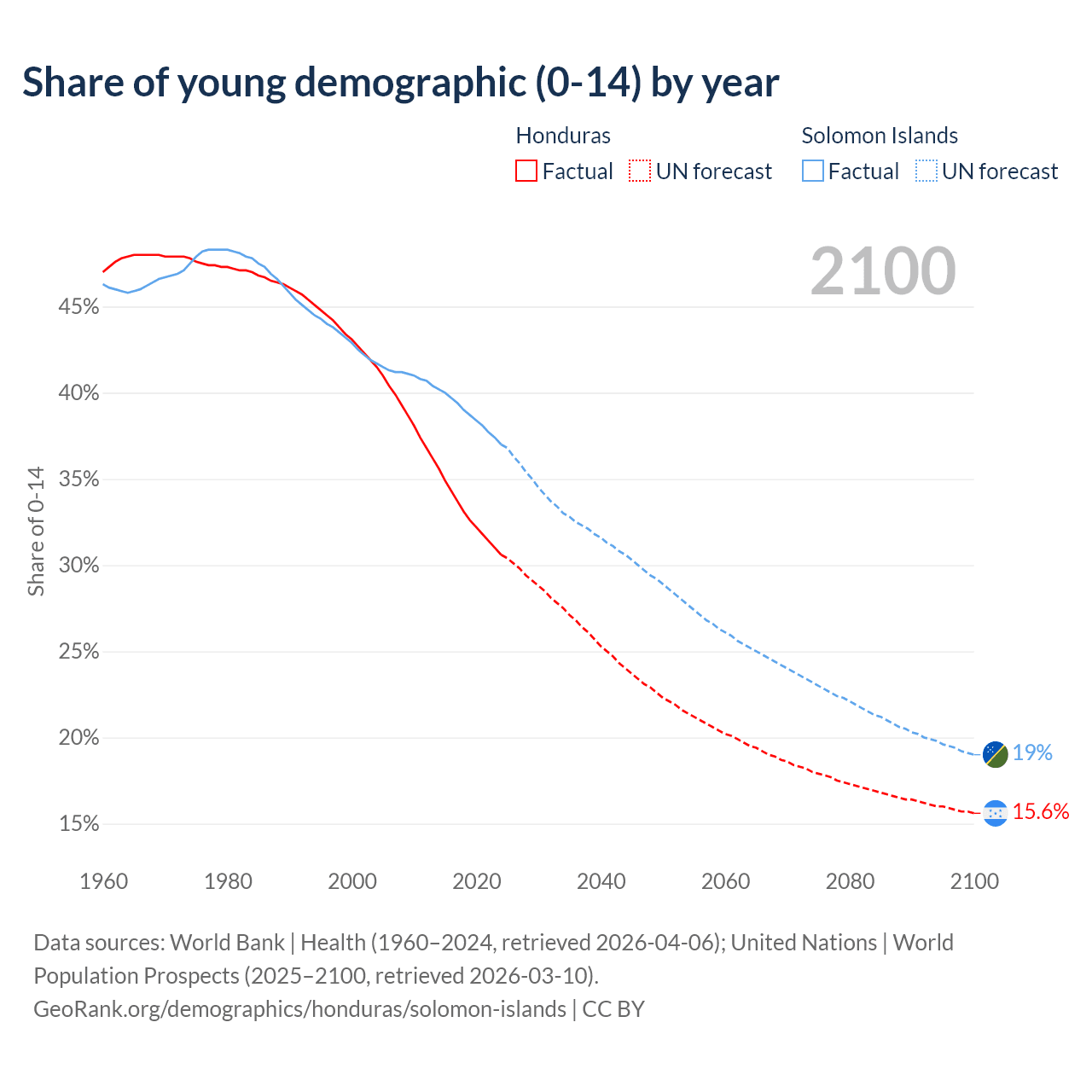 - As of 2026, the population of Honduras is 11.2M vs 864K in the Solomon Islands - 13 times difference.