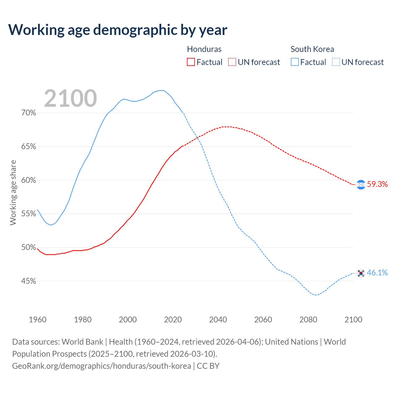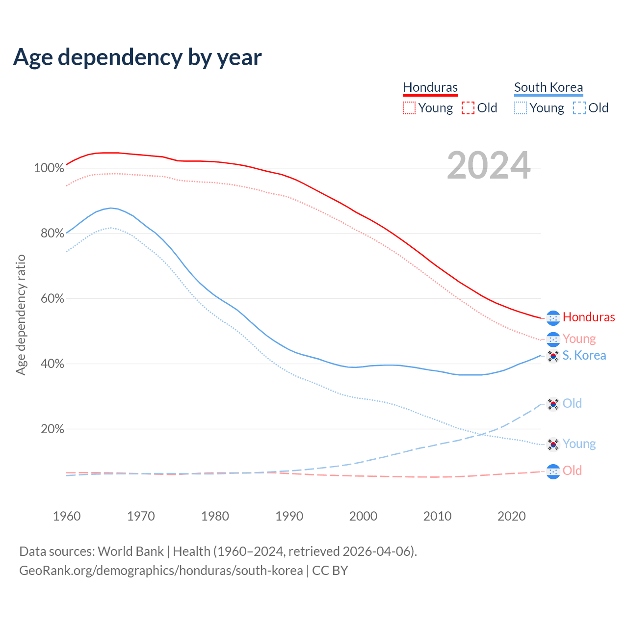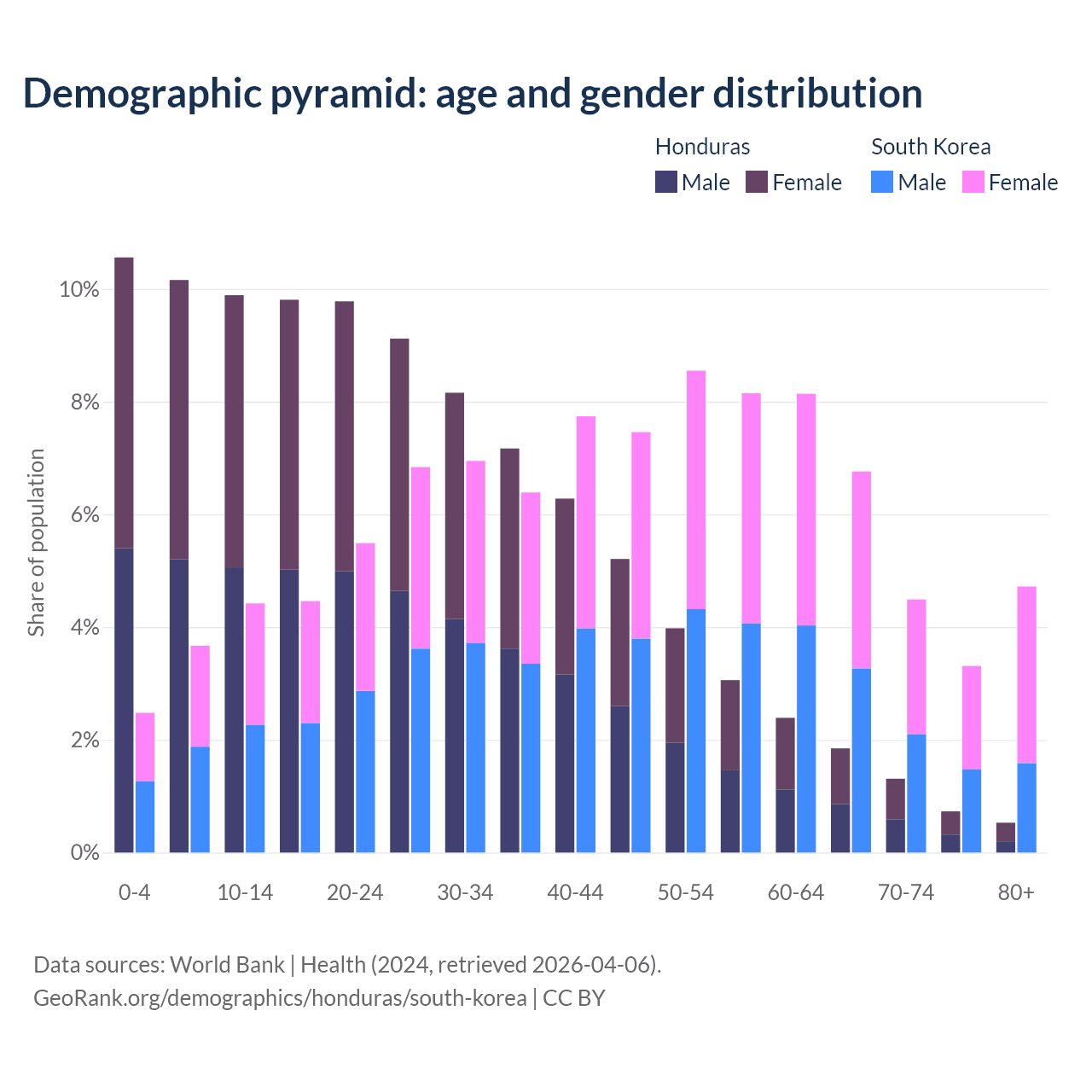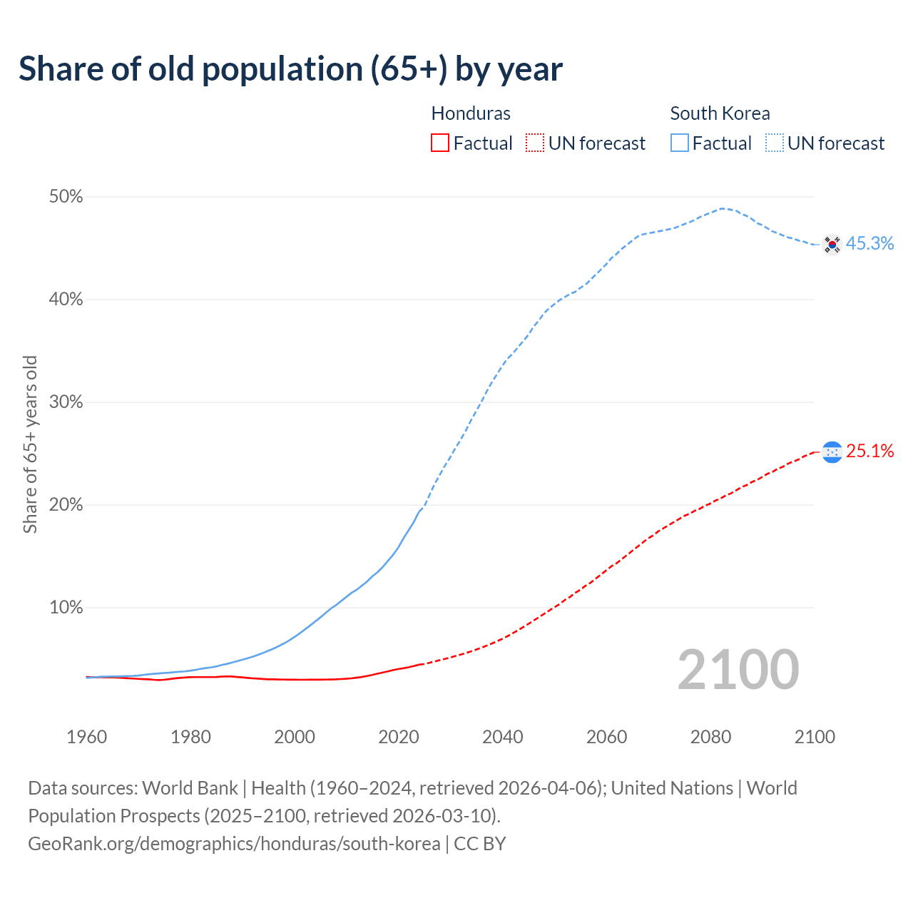 The share of older people aged 65 and over is 4.42% in Honduras and 19.3% in South Korea. Life expectancy in Honduras compared to South Korea .