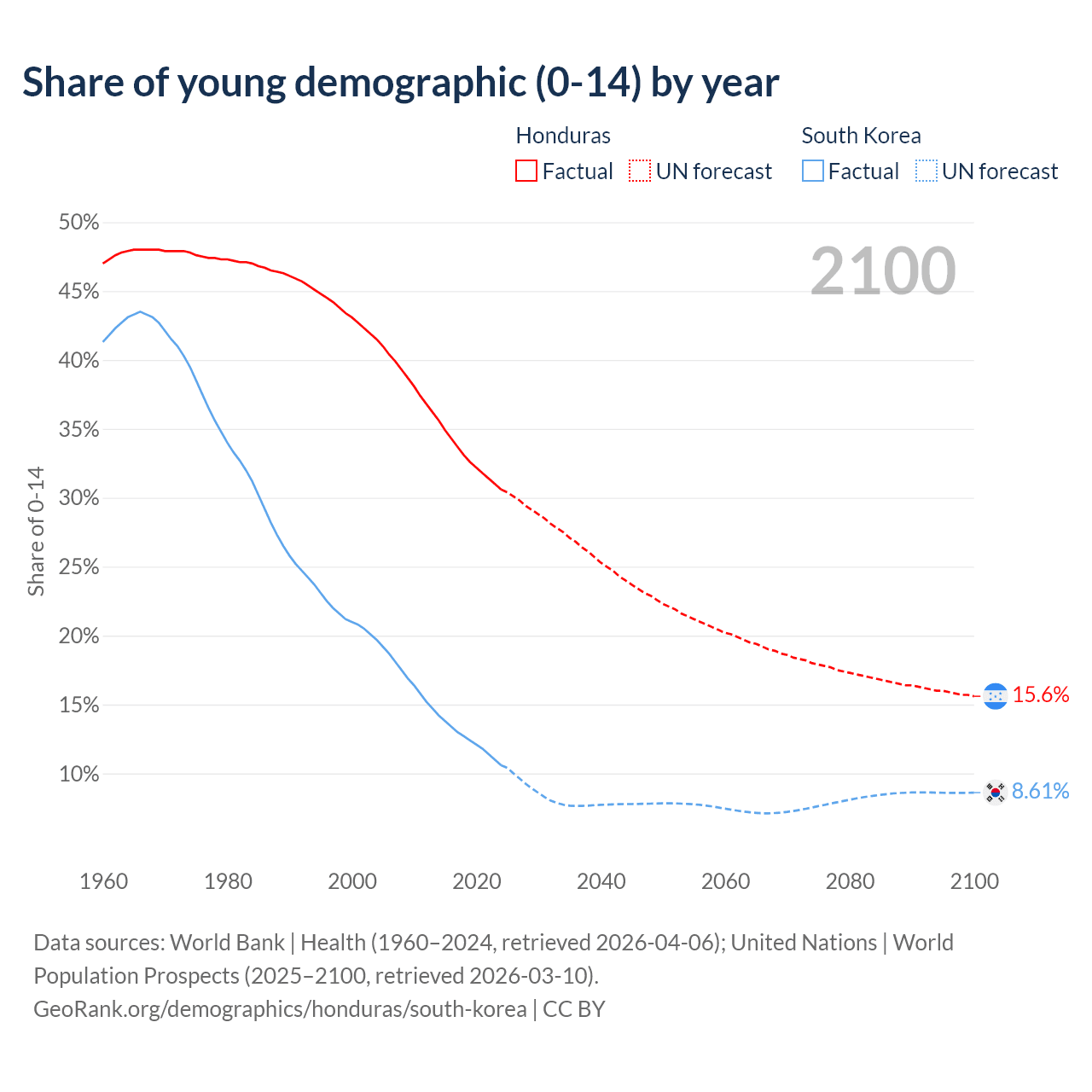 - The share of young demographic (0-15 years old) in Honduras is 30.6% vs 10.6% in South Korea.