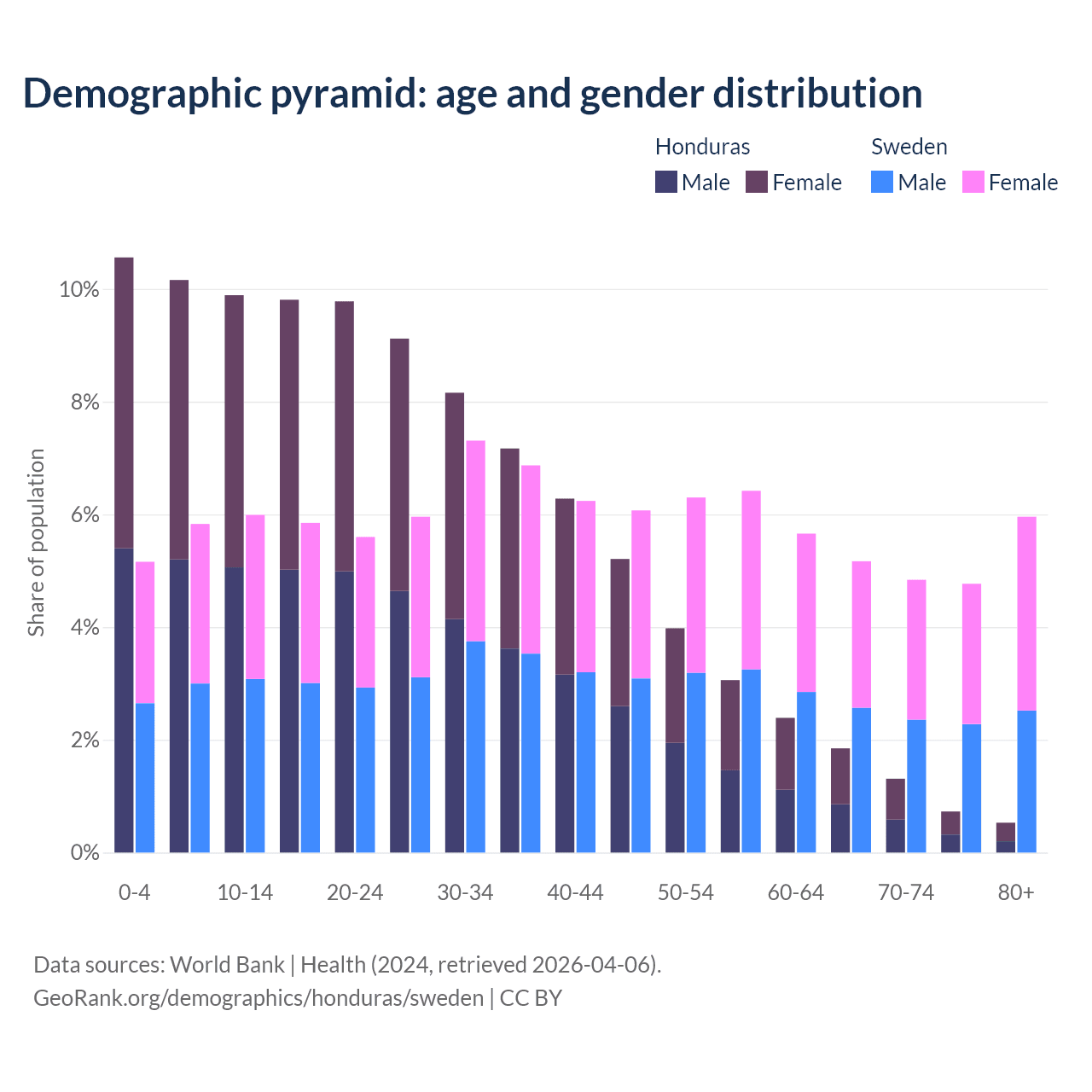 - Honduras is ranked 134/196 by median age (oldest to youngest) vs 39/196 for Sweden.