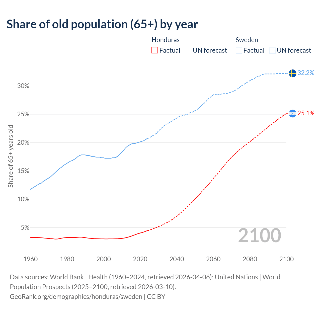 - The share of old-age demographic (65+) in Honduras is 4.42% vs 20.7% in Sweden.