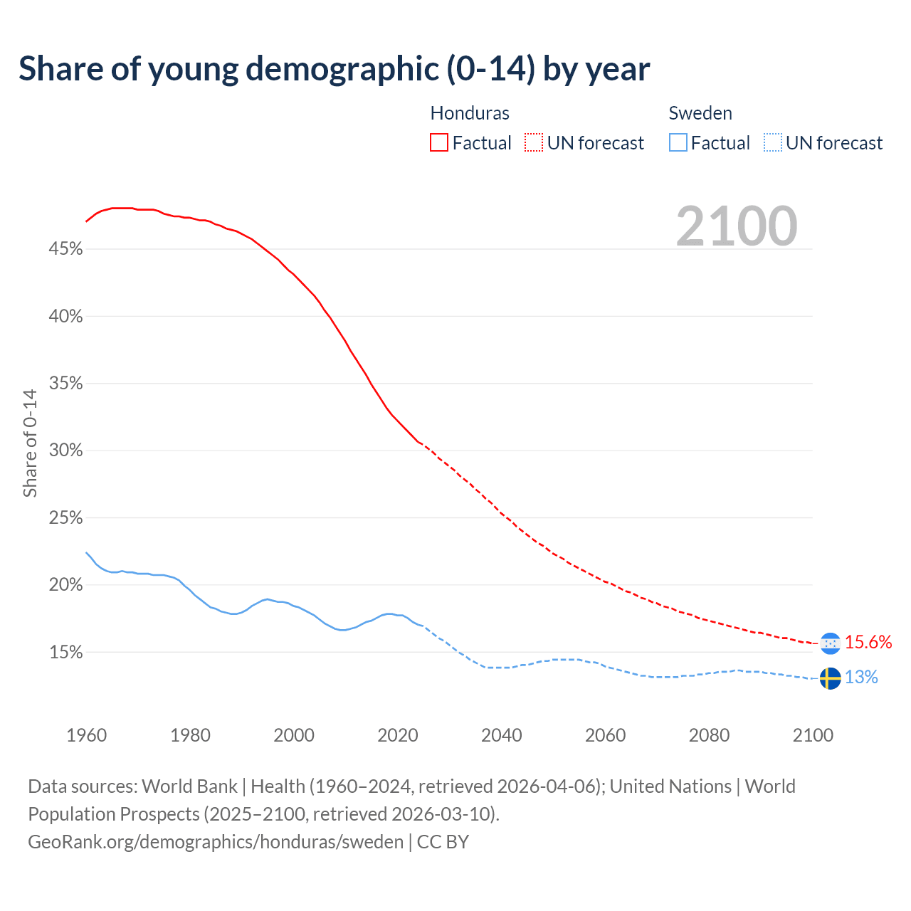 - The share of young demographic (0-15 years old) in Honduras is 30.6% vs 17% in Sweden.