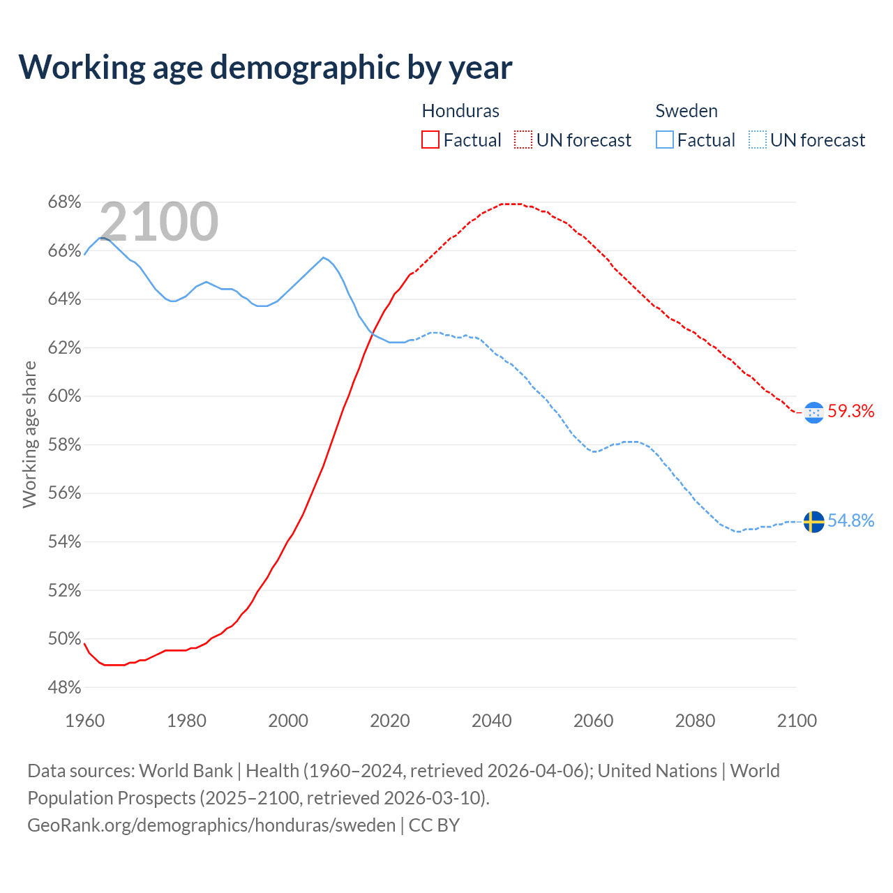 - Honduras has 7.3M working age adults (aged 15-64) vs 6.65M in Sweden.