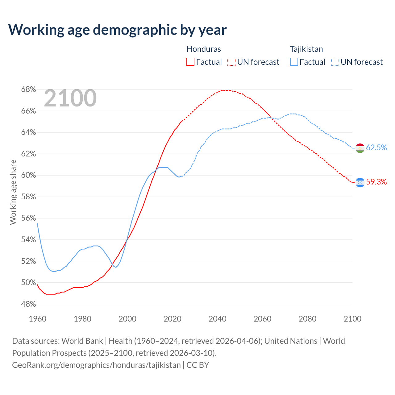 - The share of old-age demographic (65+) in Honduras is 4.42% vs 3.85% in Tajikistan.