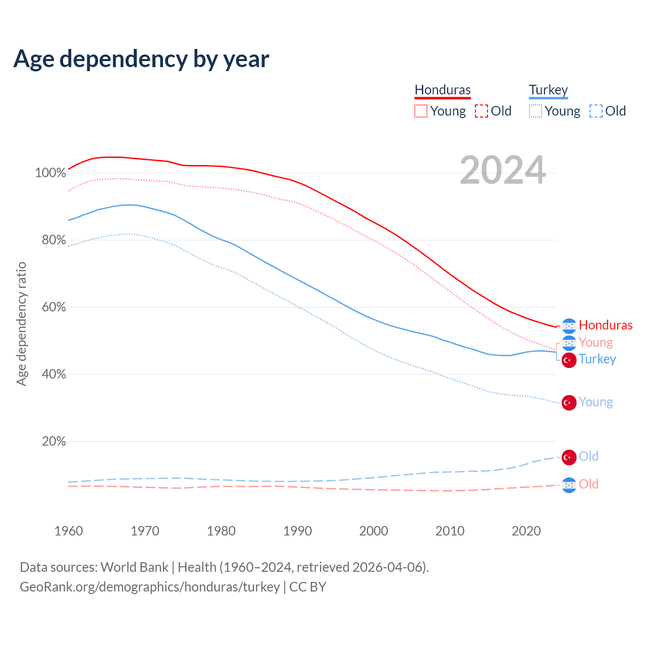 - Honduras is ranked 134/196 by median age (oldest to youngest) vs 83/196 for Turkey.