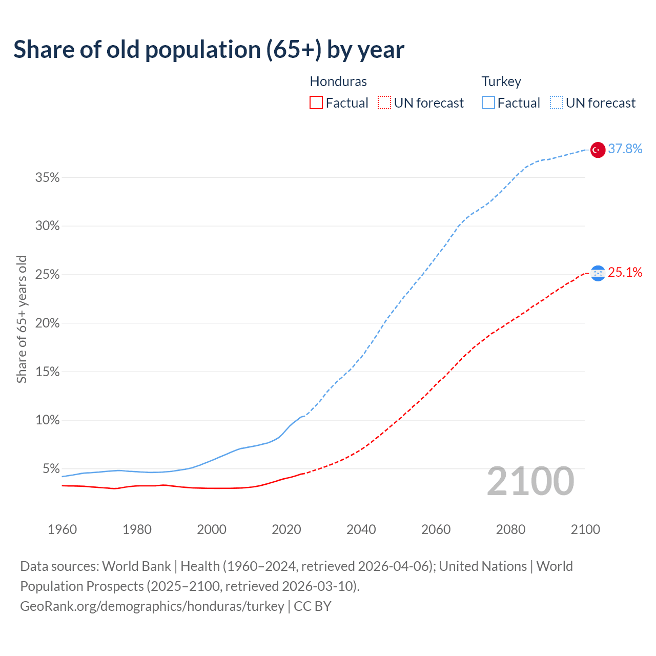 The share of older people aged 65 and over is 4.42% in Honduras and 10.3% in Turkey. Life expectancy in Honduras compared to Turkey .