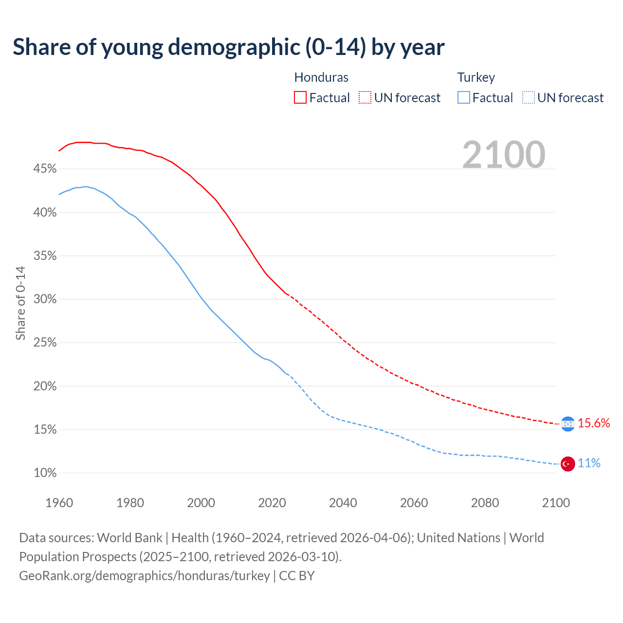 - The share of young demographic (0-15 years old) in Honduras is 30.6% vs 21.4% in Turkey.