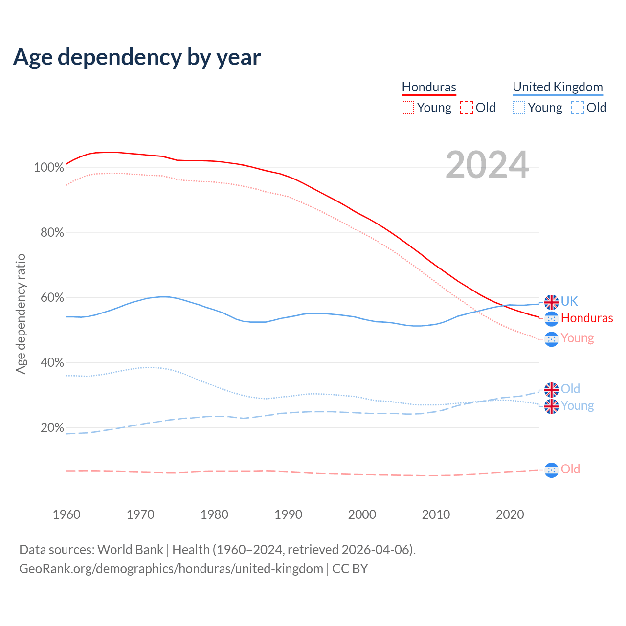 Data sources: World Bank | Health (1960–2024, retrieved 2026-04-06); U.S. Census Bureau (1960–2024, retrieved 2026-02-08).