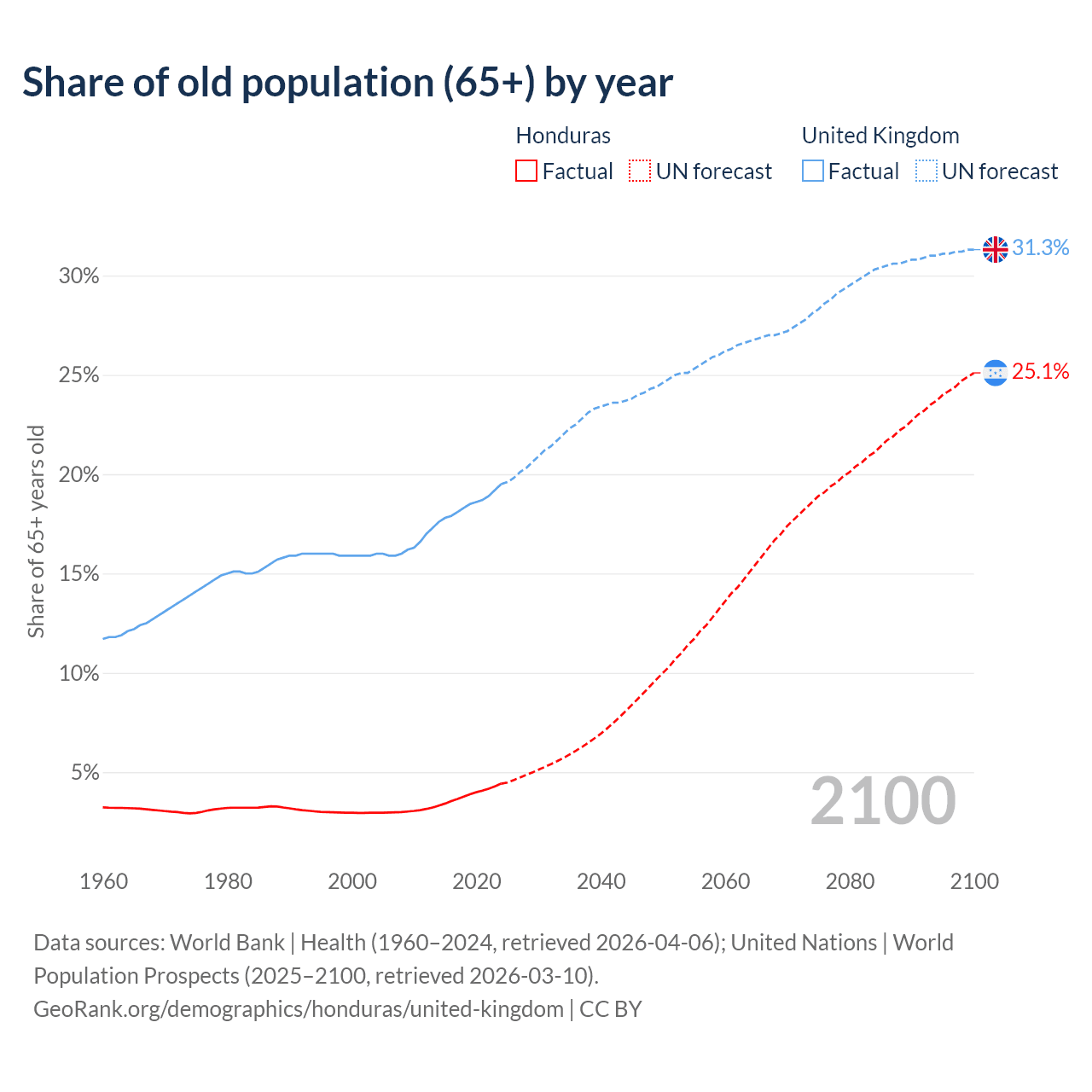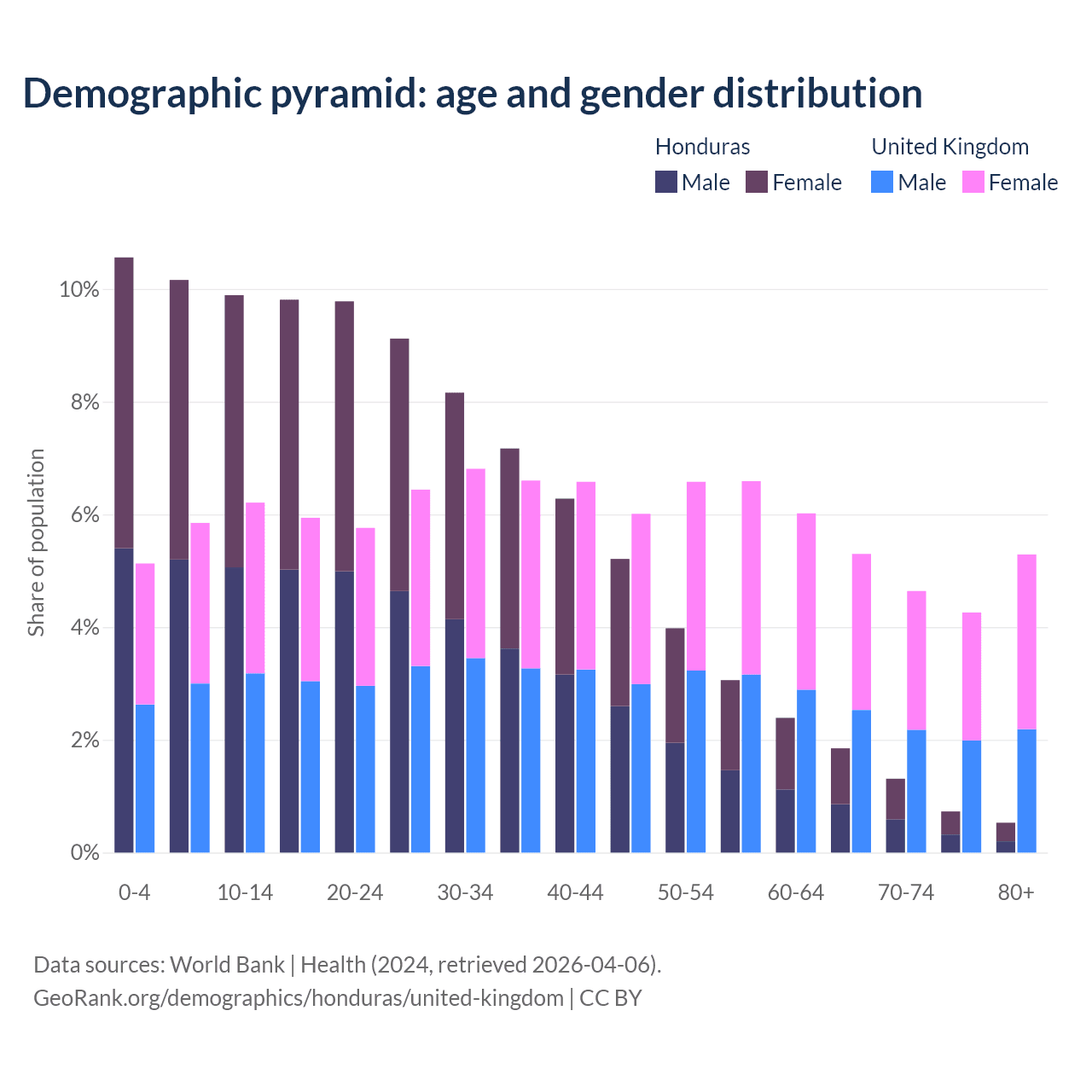 - The share of old-age demographic (65+) in Honduras is 4.42% vs 19.5% in the United Kingdom.