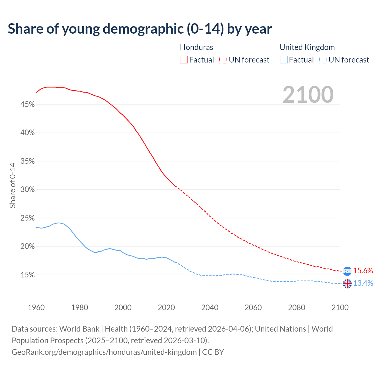 - The share of young demographic (0-15 years old) in Honduras is 30.6% vs 17.2% in the United Kingdom.