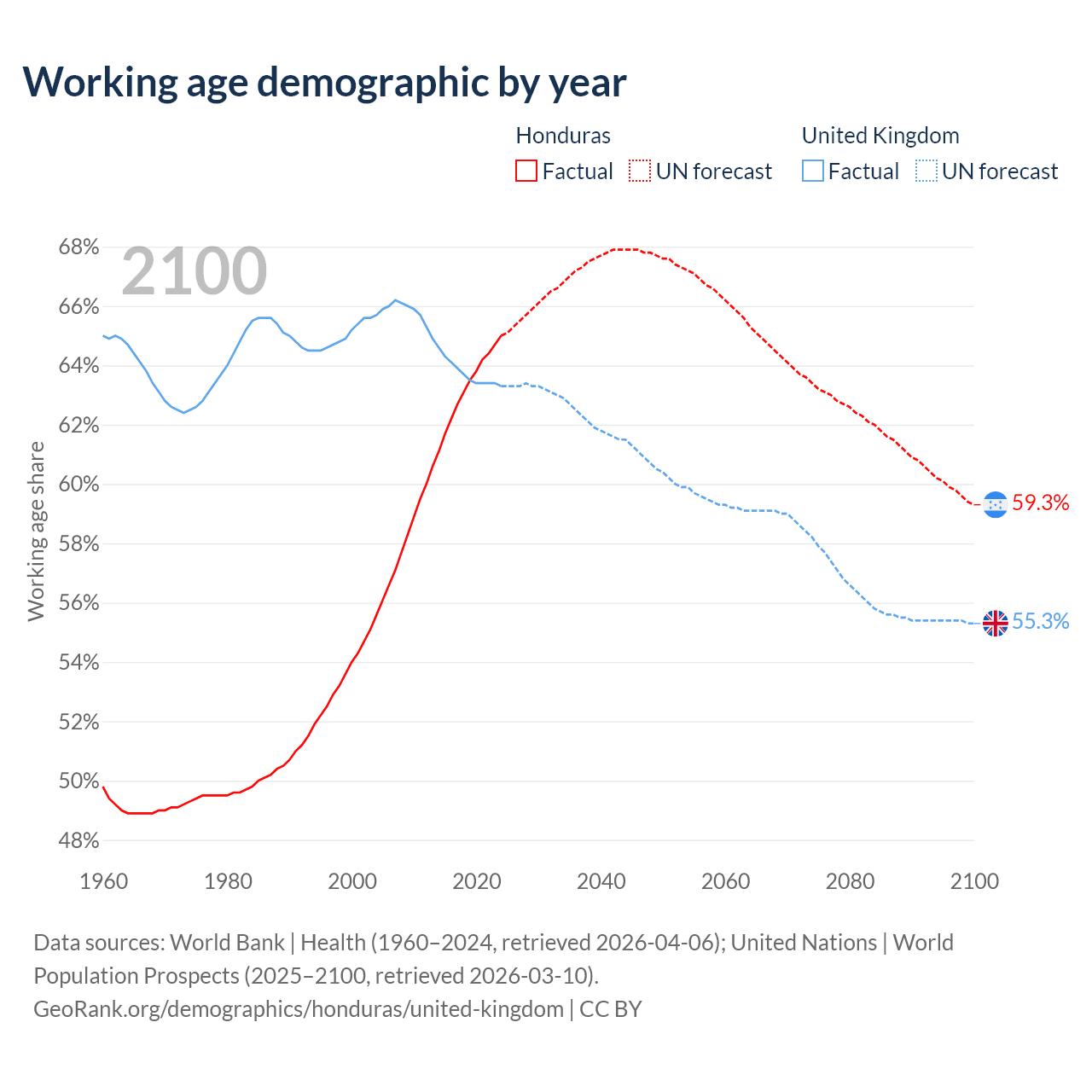 Median age Honduras vs United Kingdom, 1960-2100