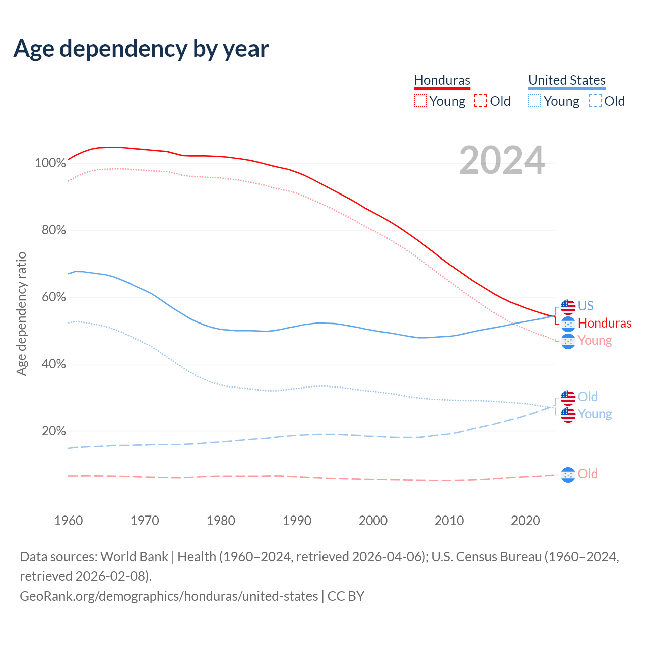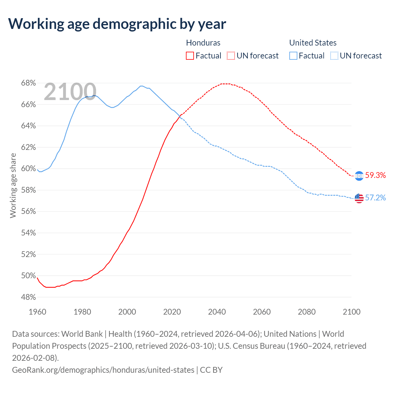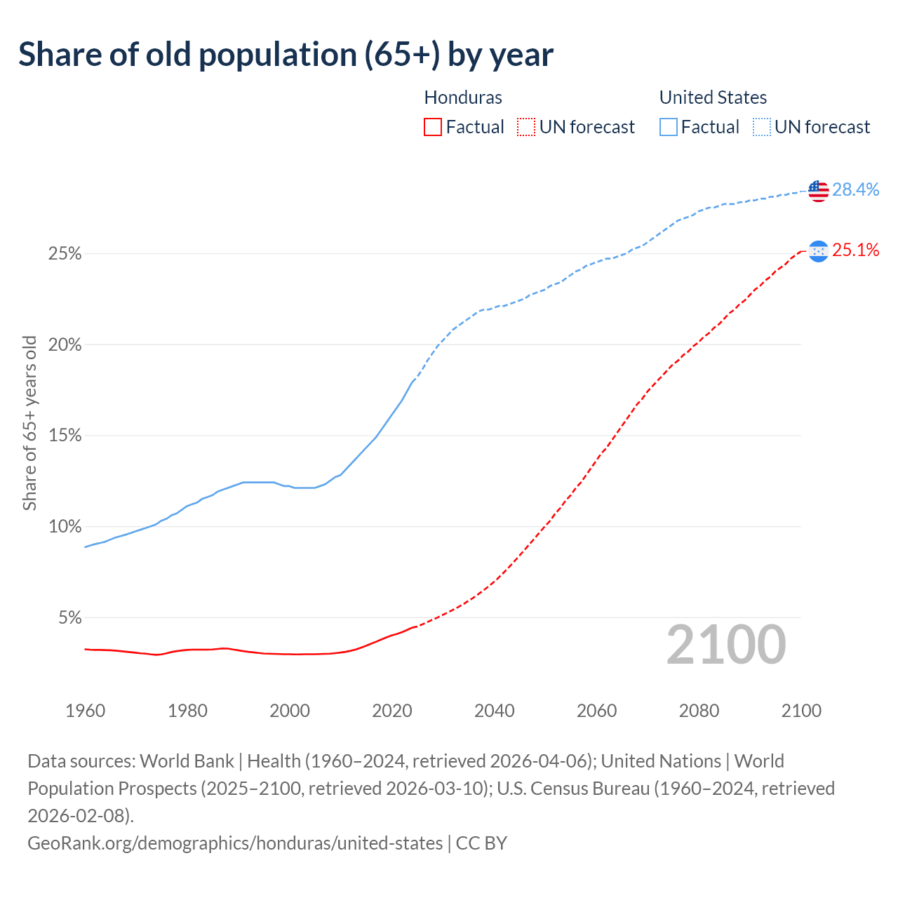 - The share of old-age demographic (65+) in Honduras is 4.42% vs 17.9% in the United States.