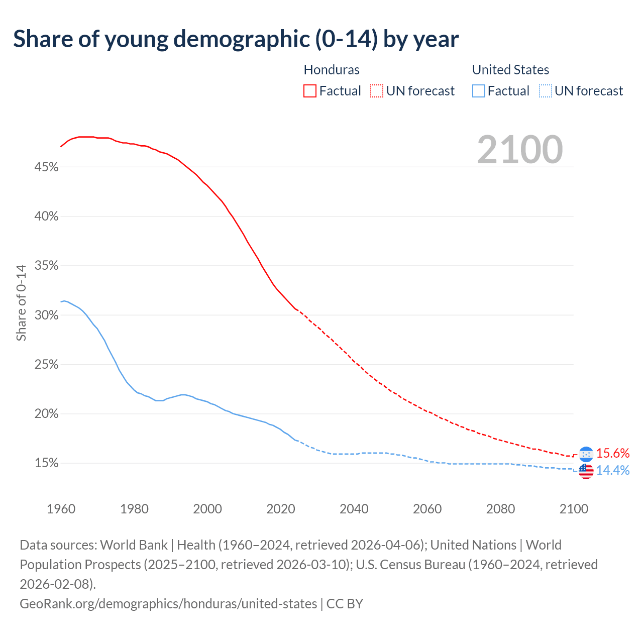- The share of young demographic (0-15 years old) in Honduras is 30.6% vs 17.3% in the United States.